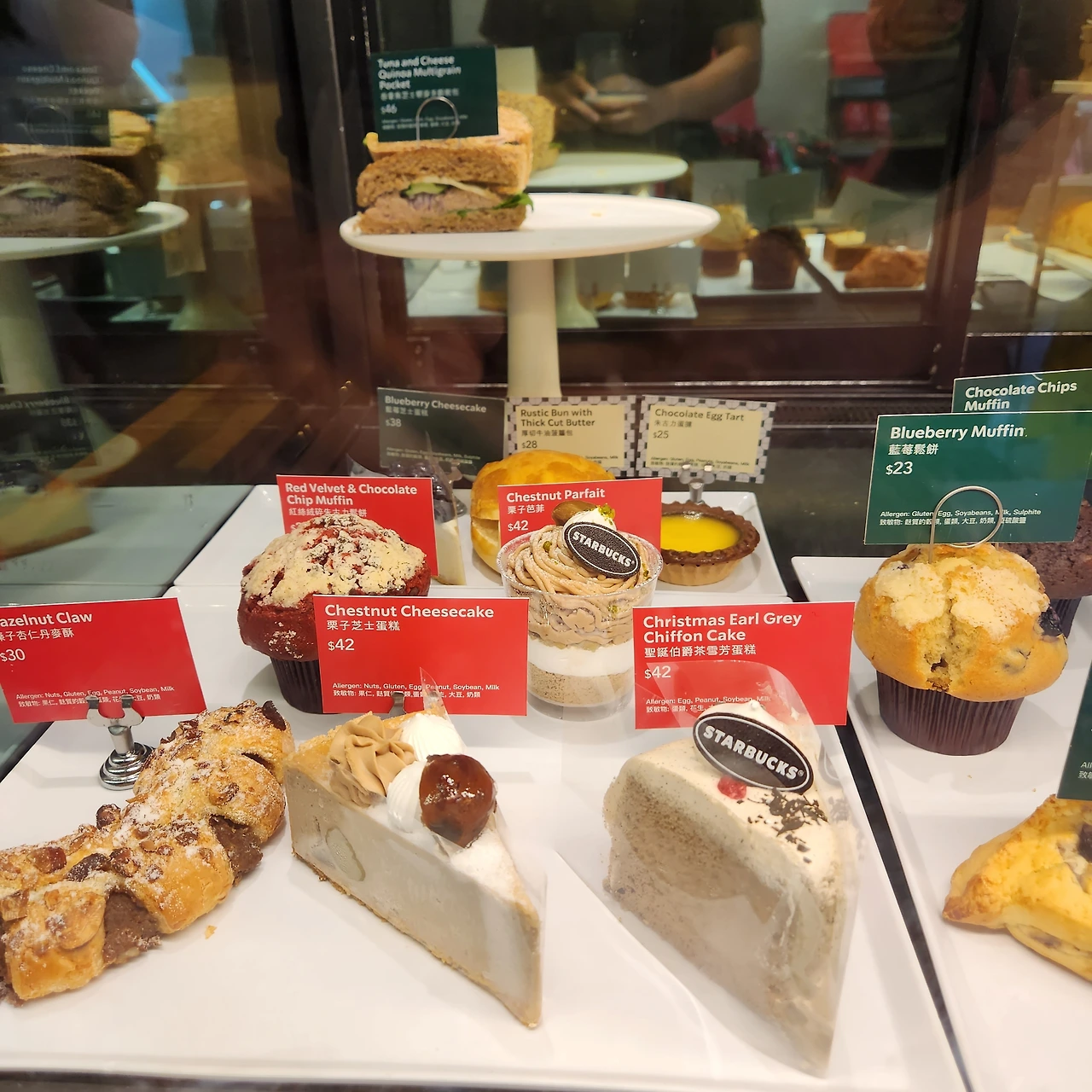 신기하게 밤이 들어간 종류가 많이 보였다. 내가 방문한 시즌이 밤이 제철이었나. 사실 제일 궁금한 건 초콜릿 에그타르트였다. 홍콩 스타벅스 에그타르트는 홍콩식일까 포르투갈식일까. 홍콩의 에그타르트는 살짝 푸딩 같은 느낌의 식감과 함께 부드럽게 으깨지는 타르트다. 반대로 포르투갈 에그타르트는 크림 같은 속과 바삭한 페스츄리다. 둘 다 먹어보니 역시 나는 포르투갈식이 더 입에 맞다. 구분하기 가장 쉬운 방법은 노란 계란 부분에 캐러멜 소시가 살짝 들어가 검게 구워졌는 지다. 검게 구웠으면 포르투갈식, 그냥 노랗게 보이면 홍콩식이다. 여기 스타벅스는 역시 홍콩이라 그런지 홍콩식에 가까웠다. 개인적으로 초콜릿과 홍콩식 에그타르트는 잘 안 어울릴 것 같아서 패스했다.