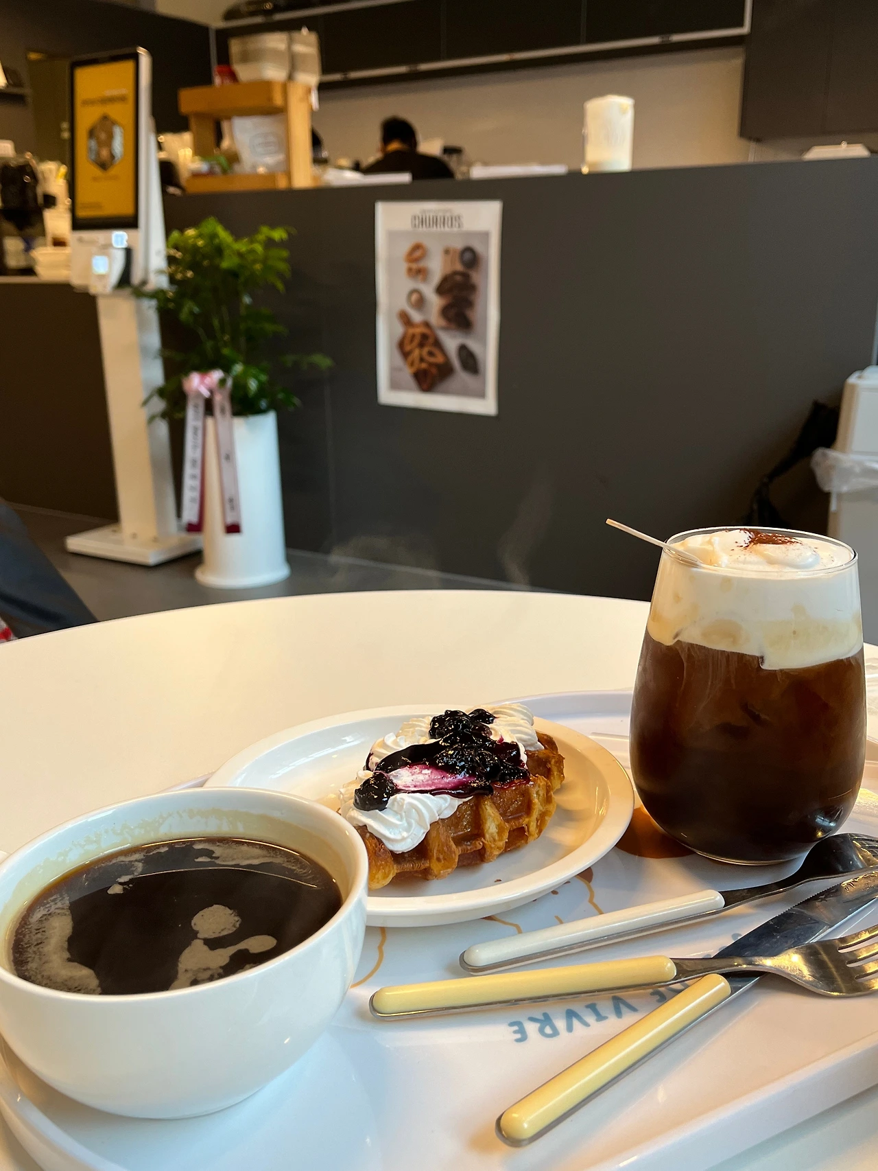 사기 당한 기분이다. 분명 오피스텔 같은 건물의 입구에는 겔란데 커피룸의 표지판이 있었다. 그리고 매장의 입구에도 겔란데커피룸이라고 쓰여있었다. 물론, 그 아래에 있는 바이크 헬맷이 살짝 이상하긴 했다. 입구에 잔뜩 쌓여있는 박스도 의심스러웠지만 인테리어는 사진으로 본 그대로라서 맞는 것 같았다. 의심이 짙어진 것은 키오스크로 음료를 주문할 때였다. 원래 먹고 싶었던 바나나 푸딩이랑 크림 라떼가 안보였다. 그러나 일단 왔으니 아메리카노와 아인슈페너, 그리고 블루베리 크로플을 주문했다.
