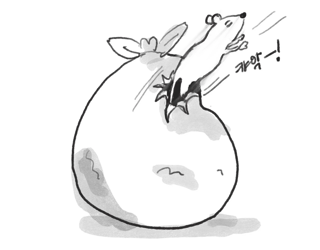 신기한 마음에 장우산으로 그 쓰레기 봉지를 툭 찔렀고, 정말 팔뚝만 한 라따뚜이가 봉지를 찢고 튀어 올랐다. 그와 동시에 우리는 소리를 지르며 집으로 내달렸다.
