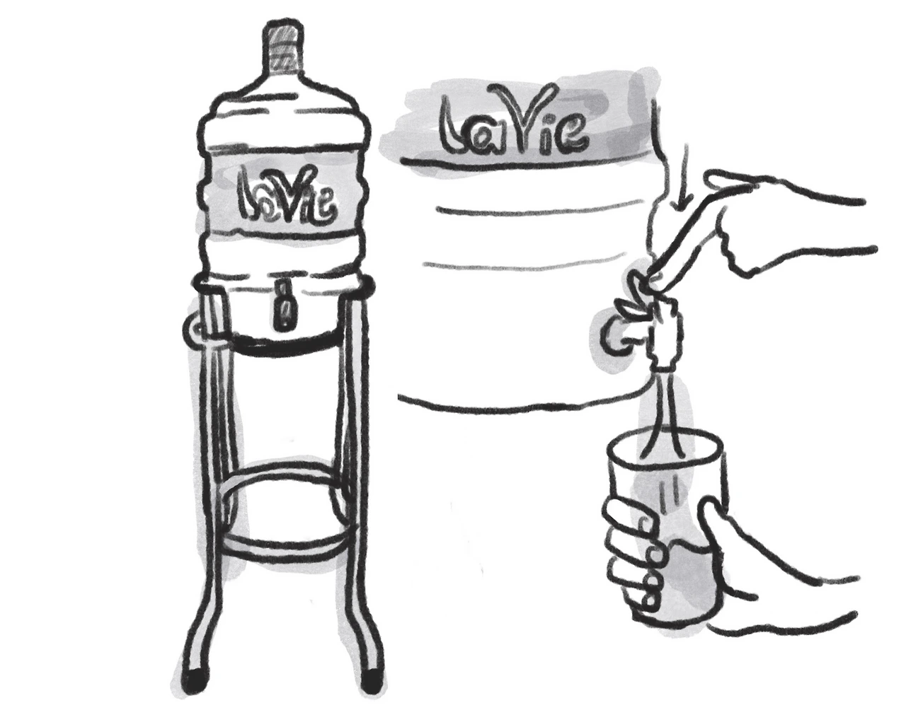 생수는 사 먹는데, 한국에서는 주로 정수기 위에 꽂혀있는 그 20리터짜리 생수통을 베트남에선 가정에 두고 생수로 사용하는 게 일반적이다. 브랜드는 라비에 (Lavie) 혹은 아쿠아피나 (Aquafina)를 마셨으며, 물 가게에 전화로 주문하면 배달받을 수 있었다.