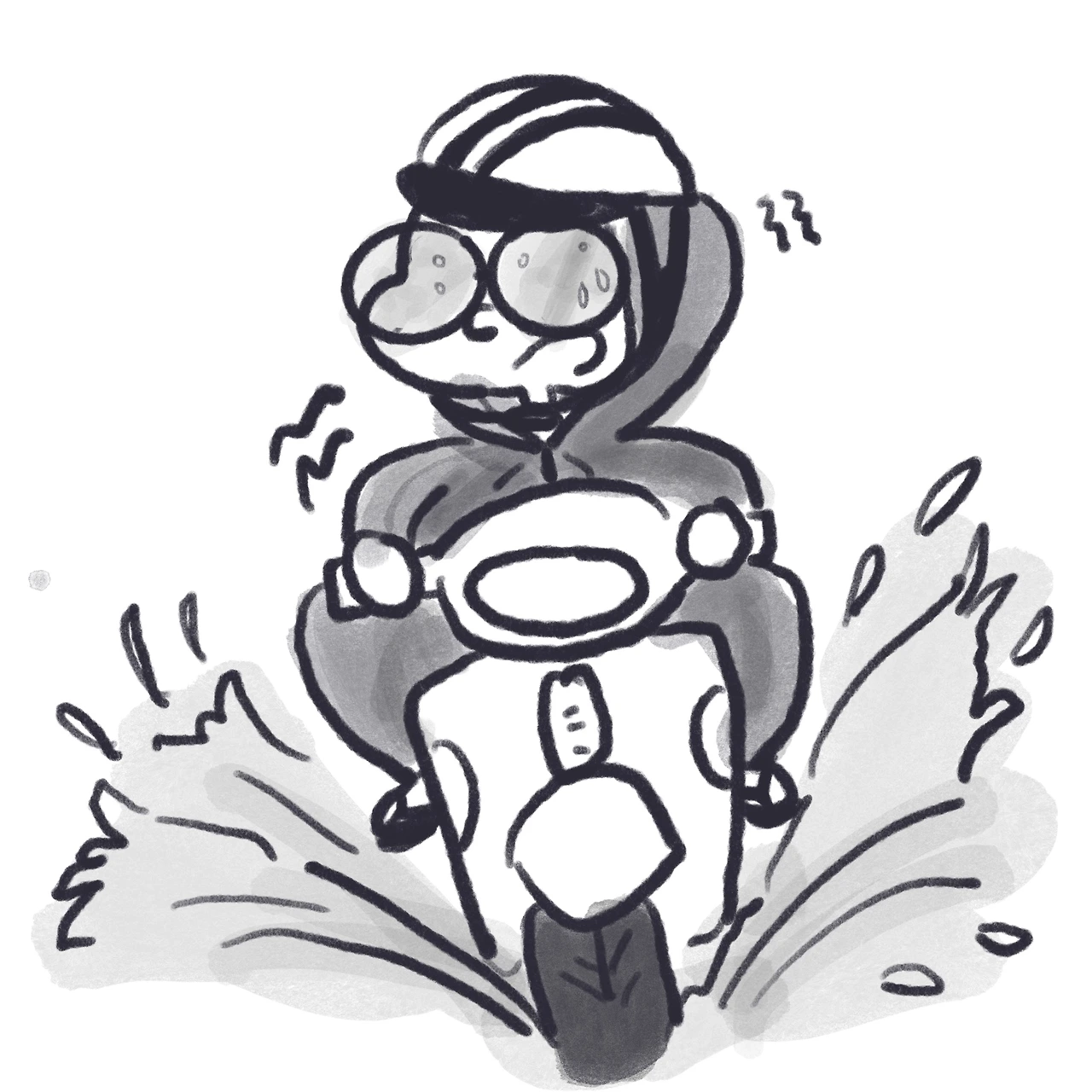 비가 심상치 않게 굵어지고 쏟아지기 시작한 뒤에서야 사람들이 급하게 갓길에 오토바이를 댄다. 그러고는 트렁크를 열어 우비를 꺼내 주섬주섬 챙겨 입는다. 헬멧을 벗고 우비에 머리를 집어넣어 입고, 가방을 우비 안으로 숨기고 그위로 다시 헬멧을 쓴다. 물론 아주 심한 폭우가 쏟아질 경우 위험하기 때문에 처마 밑에서 비를 잠시 피하고 가지만, 웬만한 빗줄기는 뚫고 달린다.