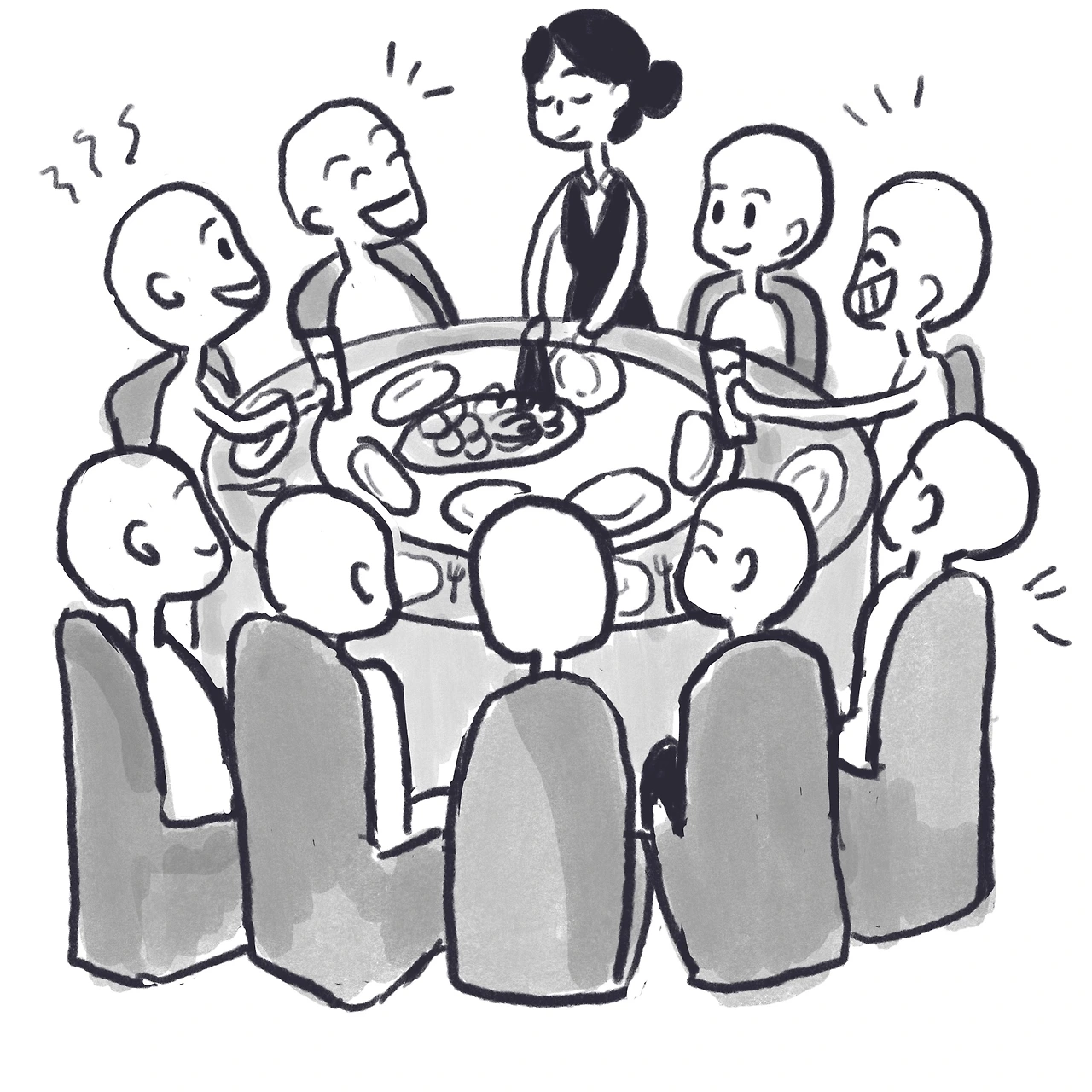 중식당에 가면 볼 수 있는 돌아가는 원판이 가운데 있는 커다란 원형 테이블에 10명 정도가 둘러앉는다. 식당으로 이동할 필요 없이 앉은자리에서 음식이 코스대로 차례로 서빙되고 서버들이 음식을 나눠 담아 준다. 그렇게 밥을 먹으면 되는데, 주로 게살죽, 샐러드, 생선구이, 핫팟, 째(베트남 디저트) 같은 것들이 주로 나온다.