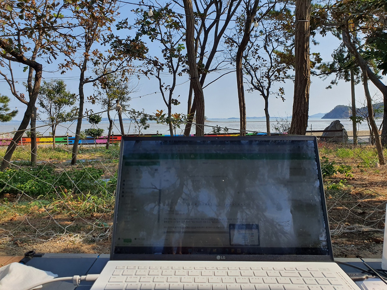 처음엔 텐트 안에서 난로 옆에 앉아, 아침 먹고 난 테이블에서 일했다. 그러다가 텐트를 접는다고 밖으로 내보내지고, 야외에서 일했다. 이왕 앉는 거 바다를 향해 앉았다. 아침 햇살에 노트북 모니터가 잘 보이지 않지만 괜찮다. 글자를 읽을 수만 있으면 된다. 어쨌든 이날 할 일을 잘 마치는 게 중요하다.