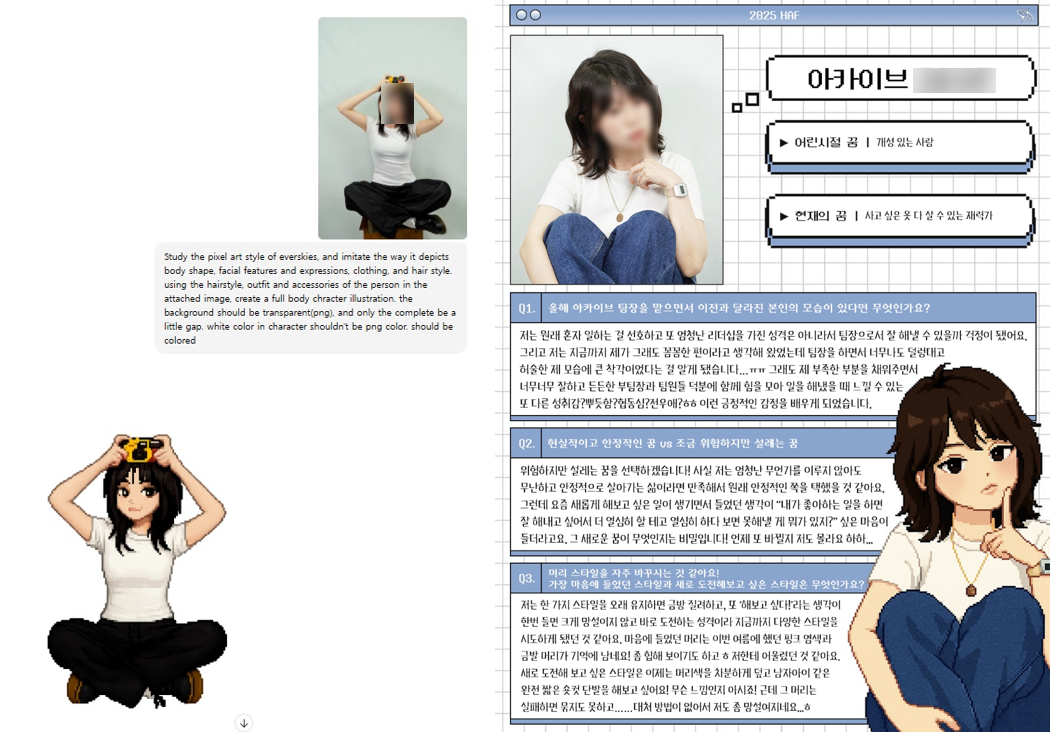 HAF 아카이브팀 공식 인스타그램 지면 인터뷰에서 요즘 유행 중인 ChatGPT 픽셀아트 캐릭터 이미지를 생성해 자신만의 캐릭터를 만들어 학우들에게 색다른 즐거움을 주었습니다.