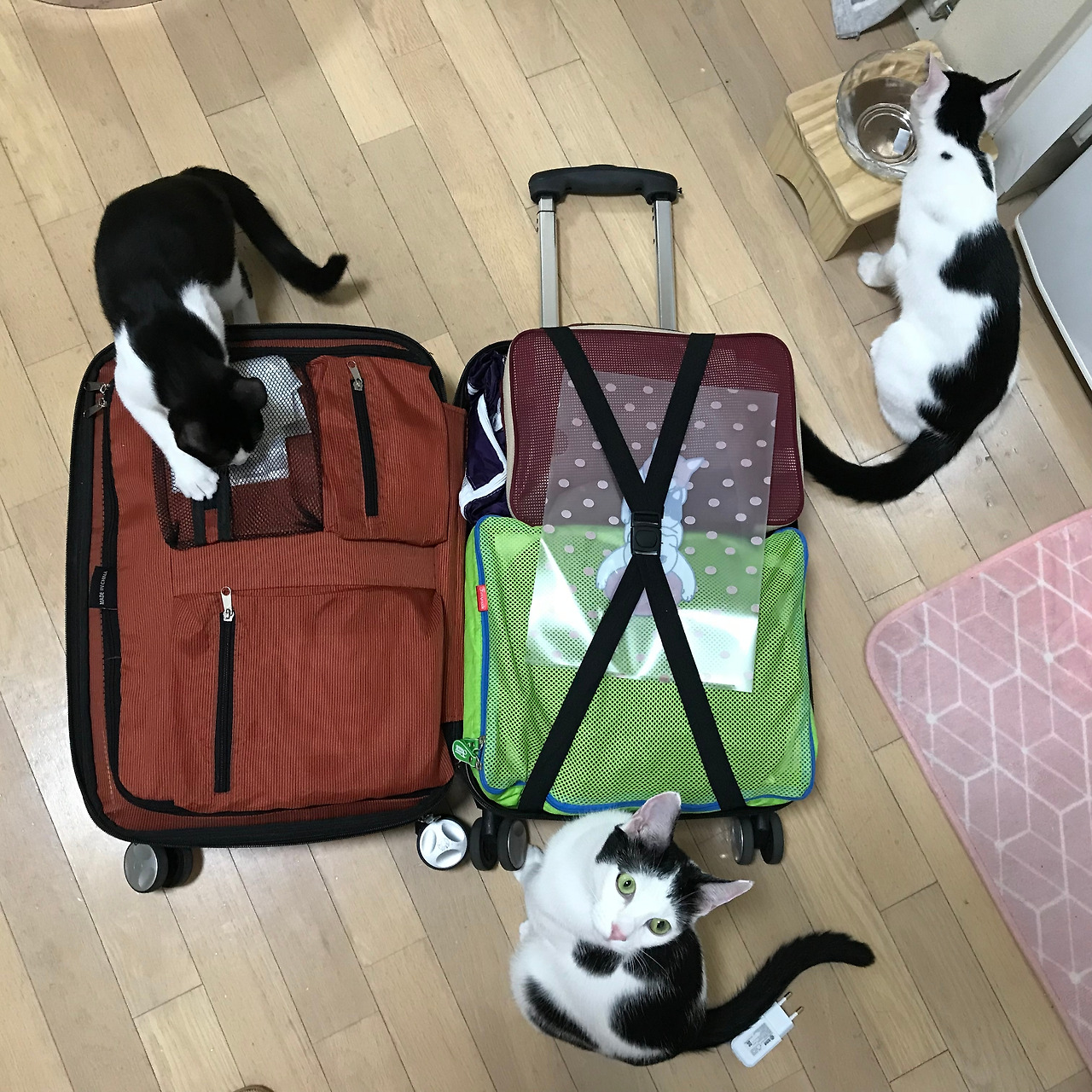 이쁜이와 규리, 웅이가 번갈아 캐리어 위에 올라앉아 소란을 피운다.