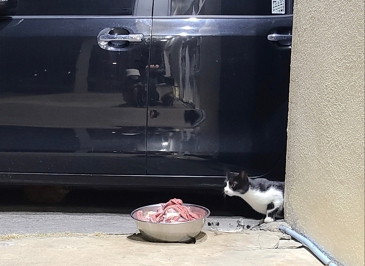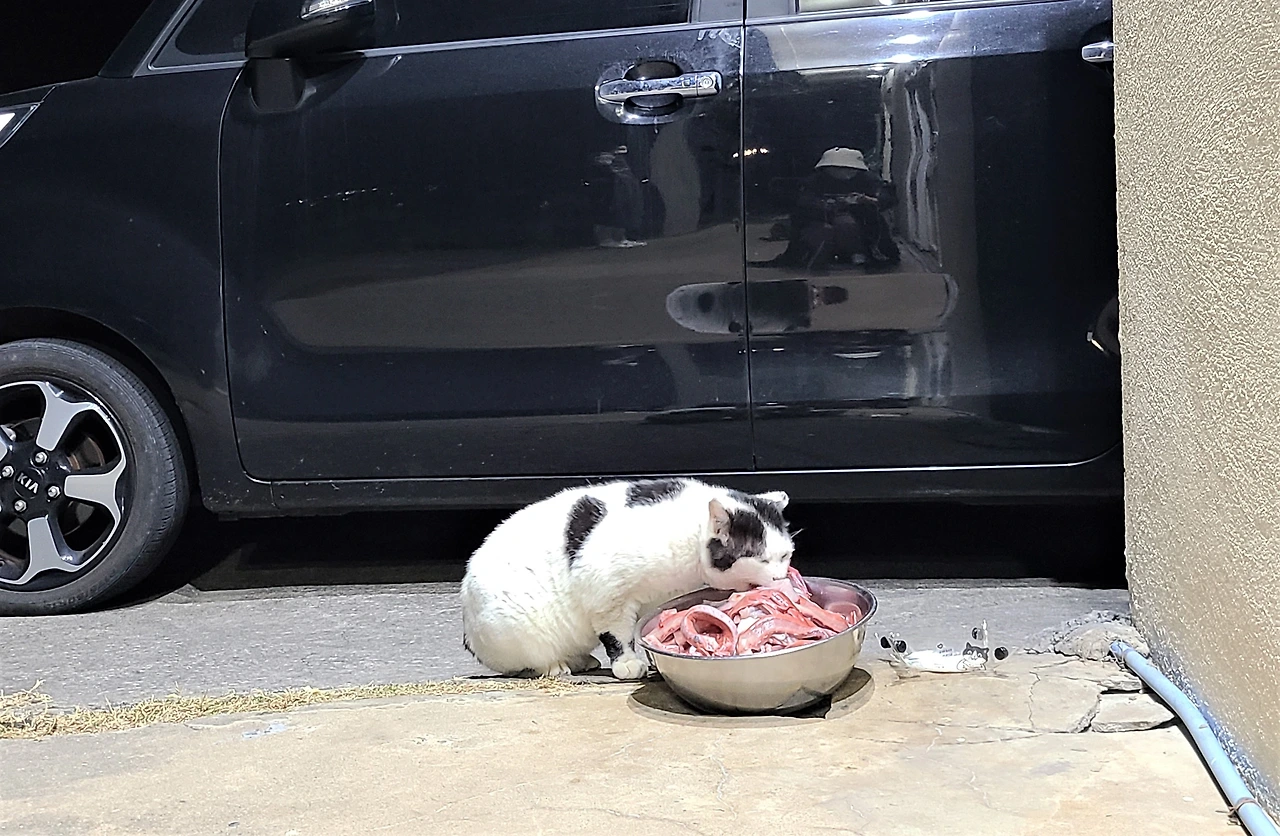 횟집에서 회를 뜨고 남은 부위를 넉넉하게 내오면, 고양이 손님들은 일사불란하게 식사를 시작한다. 가장 먼저 서열 높은 고양이들이 하나씩 회를 물고 자리를 옮기고, 그 뒤를 이어 서열 낮은 고양이들이 조심스럽게 모퉁이로 다가와 차례를 기다린다. 입을 쩍 벌려 두툼한 회를 낚아채듯 물고, 각자의 아늑한 자리에 앉아 식사를 즐기는 모습은 그들만의 규칙 같기도, 예절 같기도 하다.