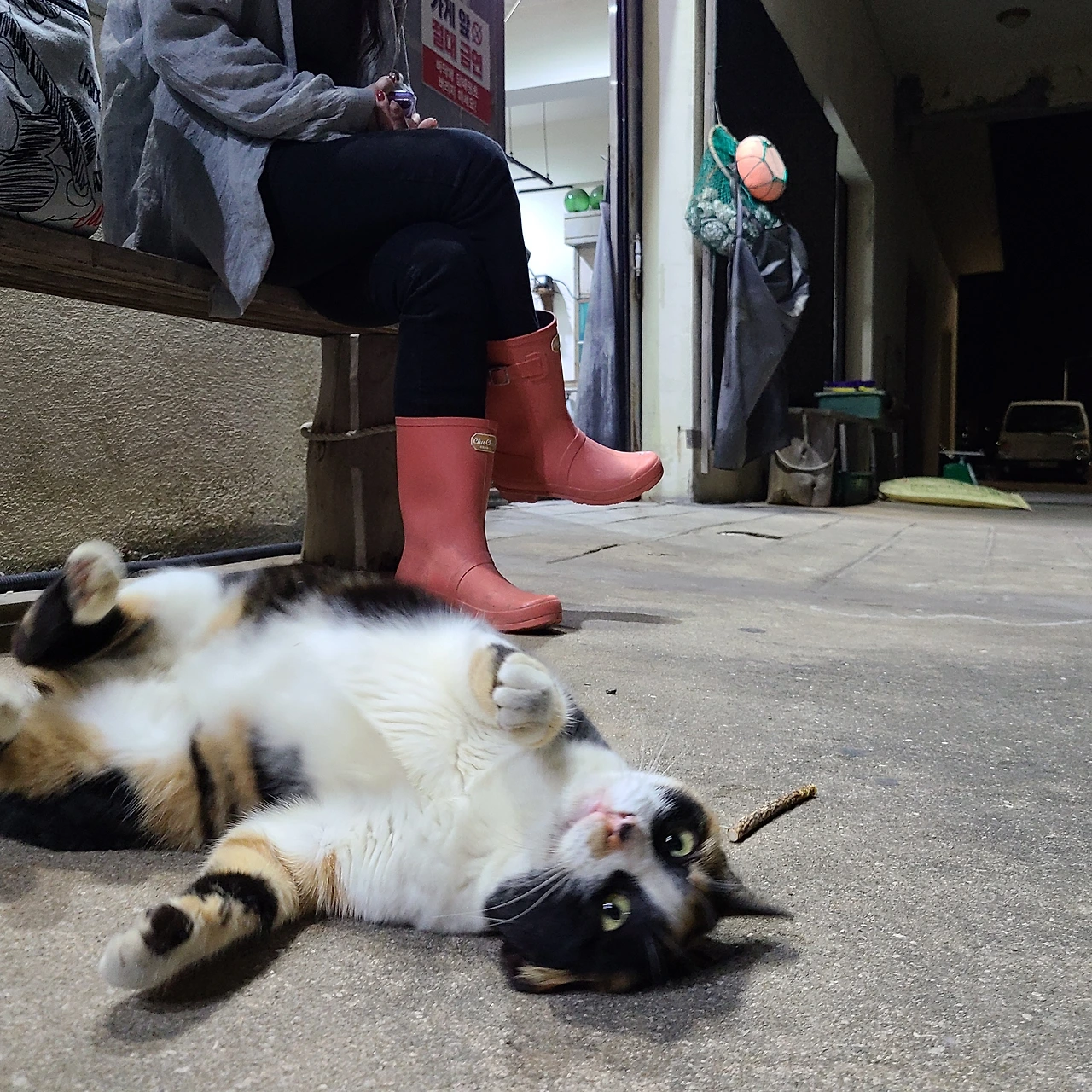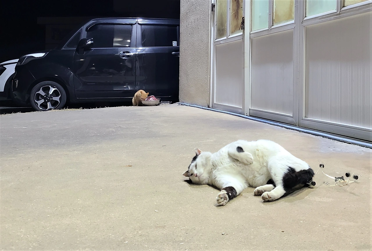 풍족한 식사에 대한 보답이라도 하듯, 고양이들은 회를 다 먹고 나면 횟집 직원 다리에 부비부비 박치기를 하고, 앞발을 쭉 뻗어 바닥에 배를 깔고 발라당 누워 애교도 부린다.