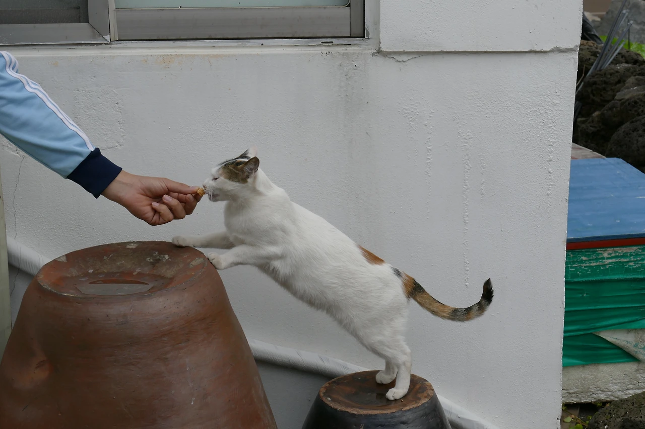 서둘러 키튼용 사료에 면역 영양제를 섞은 습식을 그릇에 담아 가까운 바위 위에 놓고, 아이들이 놀라지 않게 멀리 떨어져 지켜봤다. 5분쯤 지나자 치즈 아기 고양이의 귀가 살짝 움직이는 게 보이더니, 이내 조심스럽게 바위 위로 올라왔다. 고양이 몸보다 큰 밥그릇에 얼굴을 파묻듯 먹는 모습은 세상의 모든 귀여움을 품은 듯했다. ‘그래, 넌 꼭 살아남을 거야.’ 속으로 중얼이며 나도 모르게 미소를 지었다.