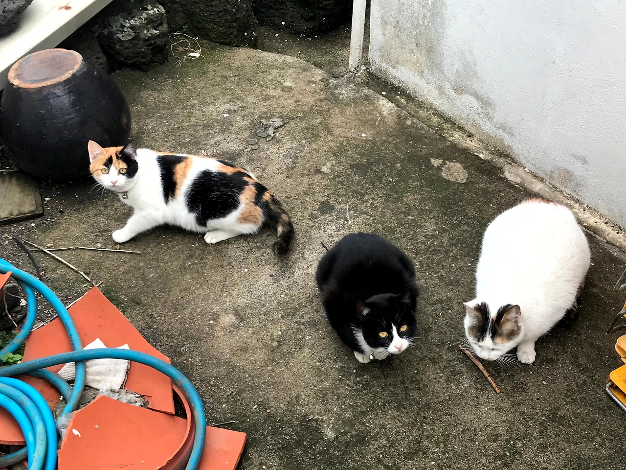어르신 댁 앞을 지날 때, 두 마리 고양이가 지붕 위에서 나를 빤히 내려다보고 있었다. 눈을 깜빡이며 인사를 건네자, 젖소 무늬 고양이가 경계를 풀고 내 앞으로 폴짝 내려왔다. 뒤이어 삼색 고양이도 조심스레 뒤를 따랐다. 마치 “언니, 우리 기억하지?”라고 말하는 듯한 눈빛이었다. 마당 한쪽에서는 우유 빛깔의 또 다른 삼색 고양이도 모습을 드러냈다. 모두가 반갑게 다가왔다.