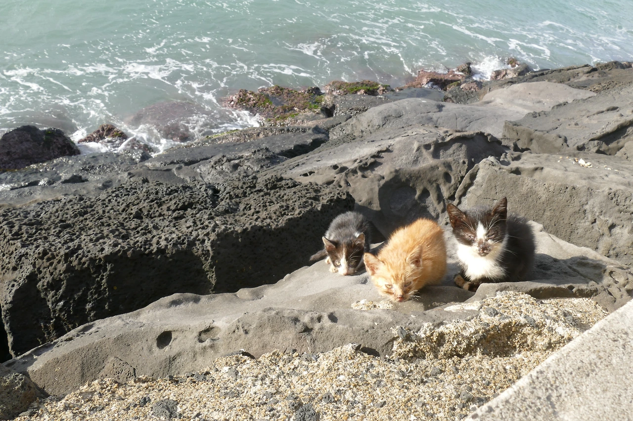 아침에 보았던 아기 고양이는 있었던 걸까. 꿈처럼 사라진 그 노란 털뭉치가 자꾸만 마음에 걸렸다. 다시 그 자리를 찾아보니, 방파제 둑 아래 바위 위에 인형같은 아기 고양이 셋이 쪼르르 앉아 있었다. 바다로 떨어질 듯 아슬아슬한 자리에 앉은 그 모습은 너무나 위태로웠다.