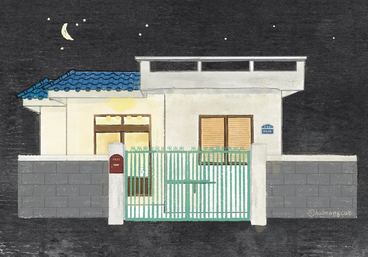 드디어 도착한 민트색 대문. 사진 속에서 익숙하게 보아왔던 바로 그곳이었다. 불빛이 새어 나오는 민박집 너머로, 히끄의 집이 눈앞에 펼쳐졌다. 예상보다 훨씬 늦은 밤에 도착한 ‘히끄네 집’.