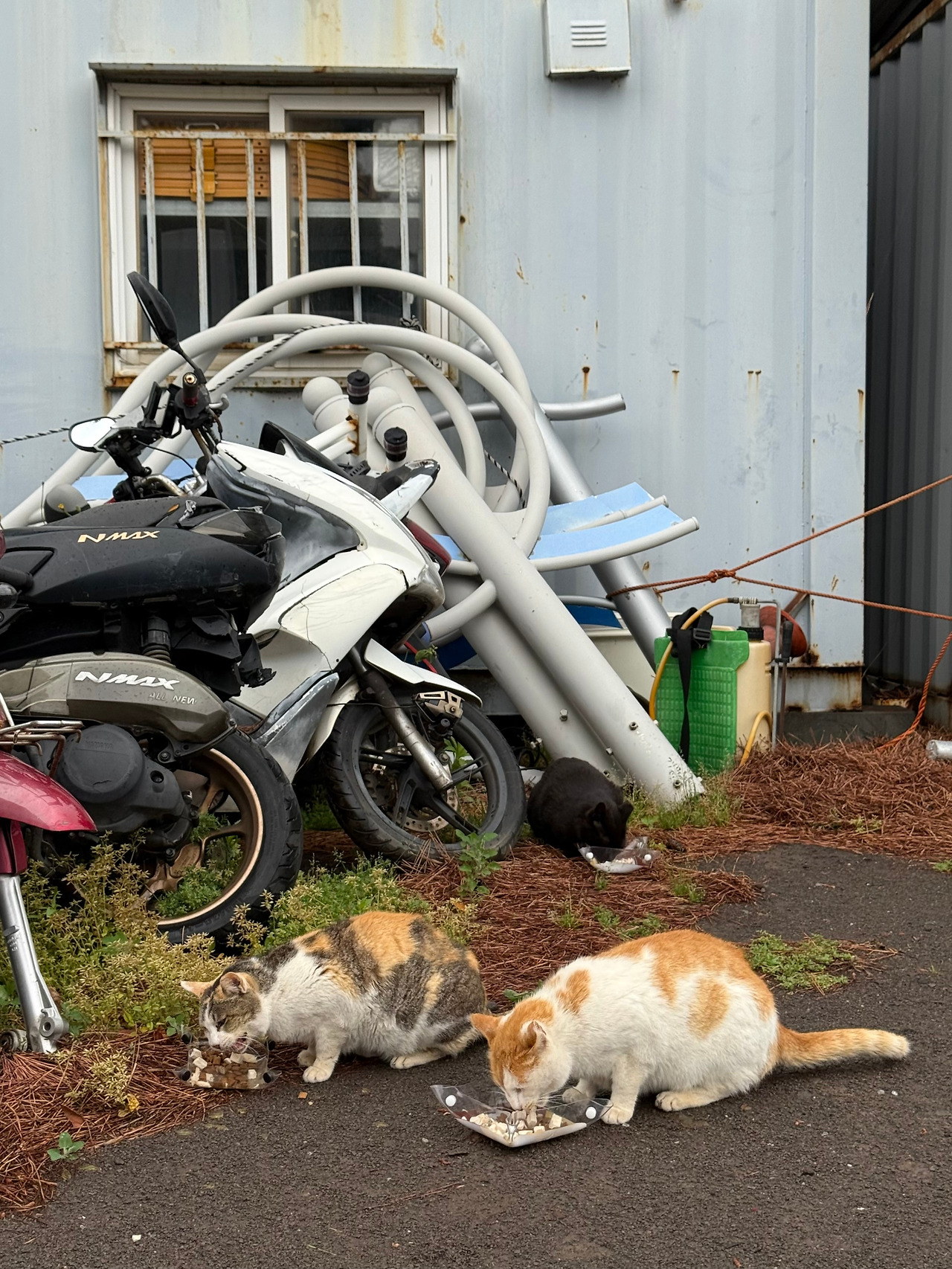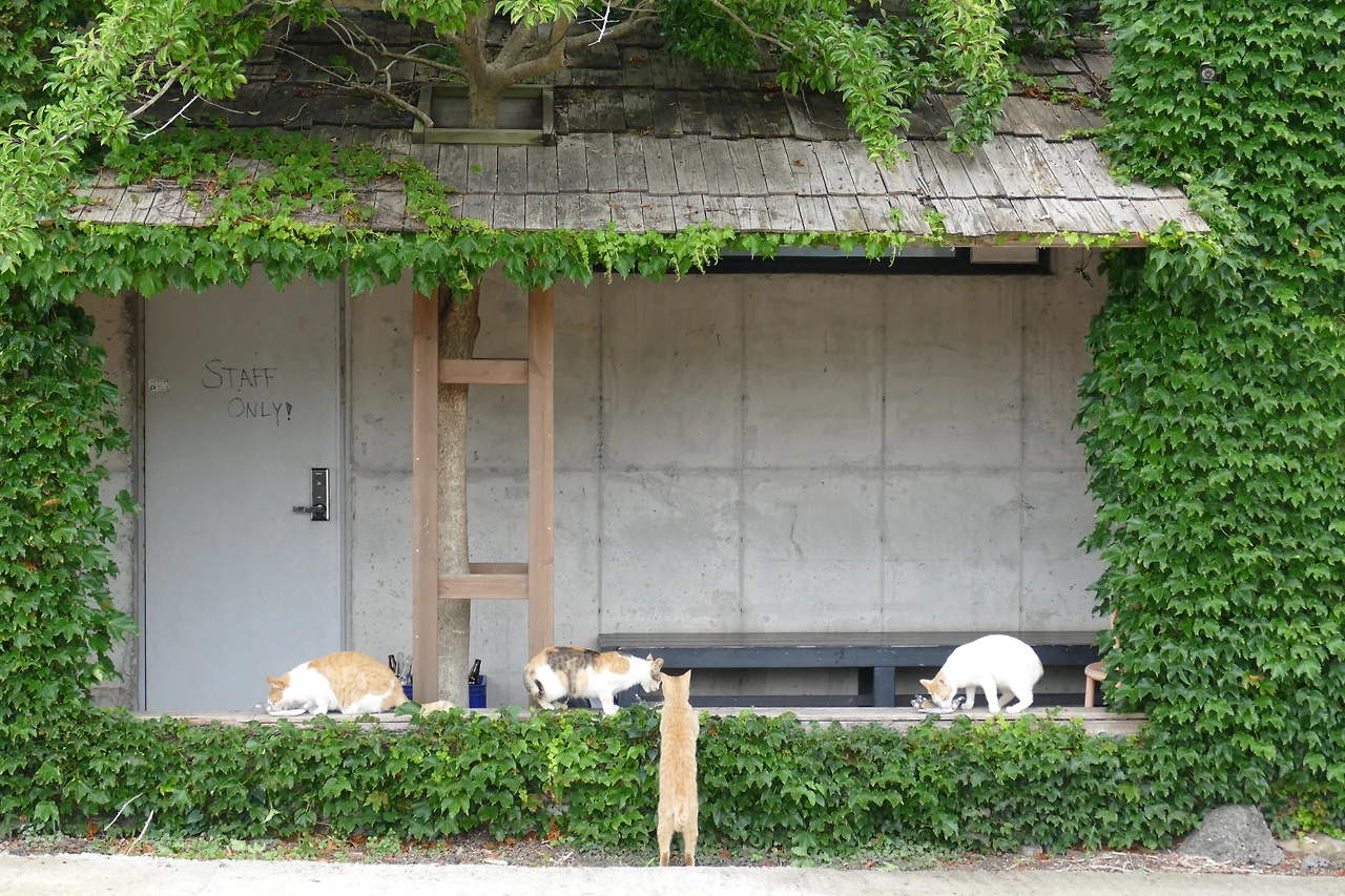 작은 그릇에 사료와 간식을 내어주자, 이내 사방에서 고양이들이 불쑥불쑥 나타났다. 앞서 사라졌던 크림빛 앞머리의 흰 고양이가 다시 모습을 드러냈고, 그 뒤를 따라 치즈 고양이 둘과 고등어 무늬 고양이도 합류했다. 요술 방망이라도 흔든 듯, 건물 곳곳에서 뿅뿅 튀어나왔다. 다섯 마리의 눈빛이 재촉하듯 내 앞에 모였고, 나는 잠시 삼색이를 잊은 채 그 아이들과 식탁을 나누었다. 사각거리는 소리와 고양이들의 집중한 표정이 낯선 길 위의 긴장을 풀어주었다.