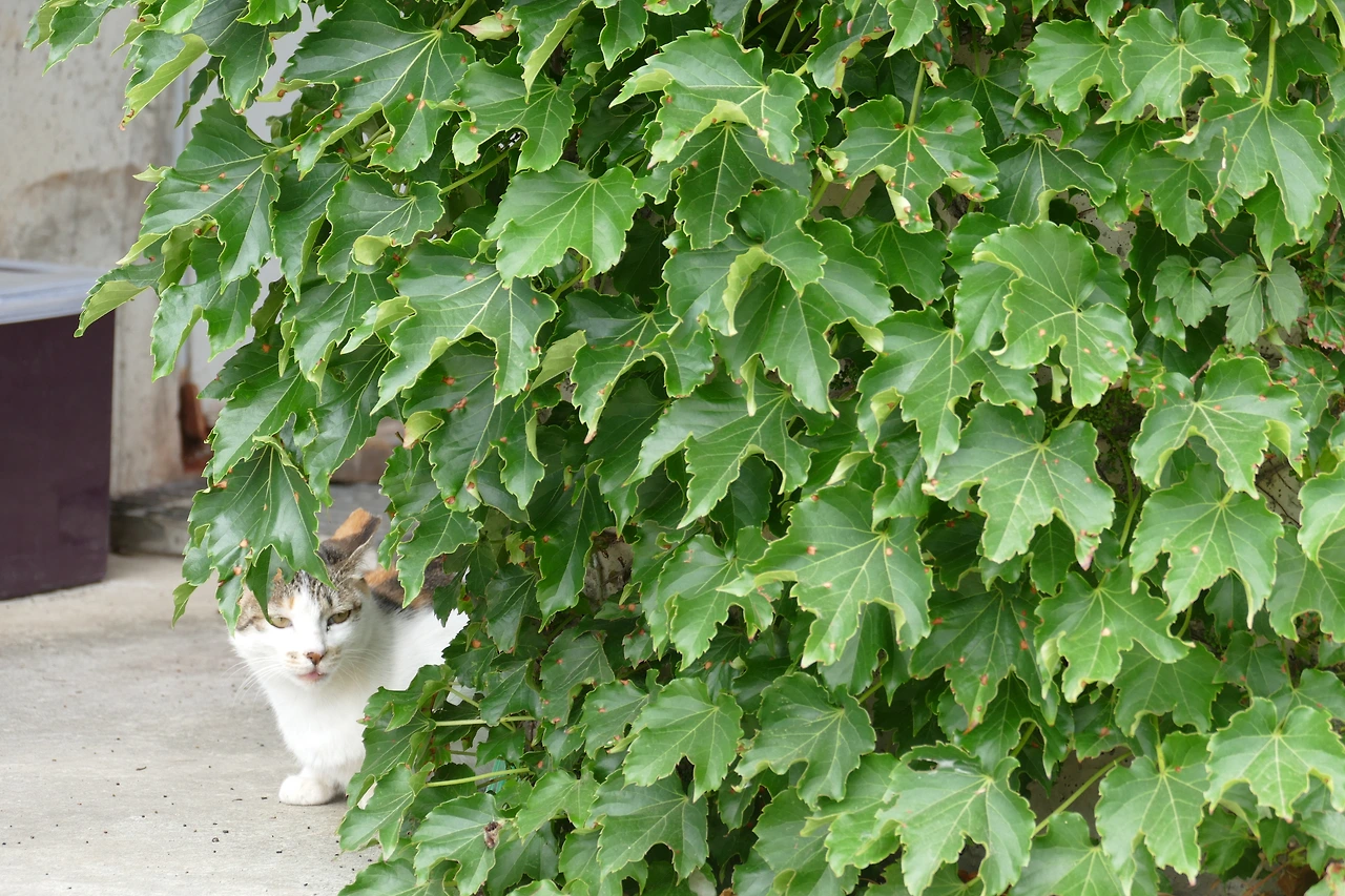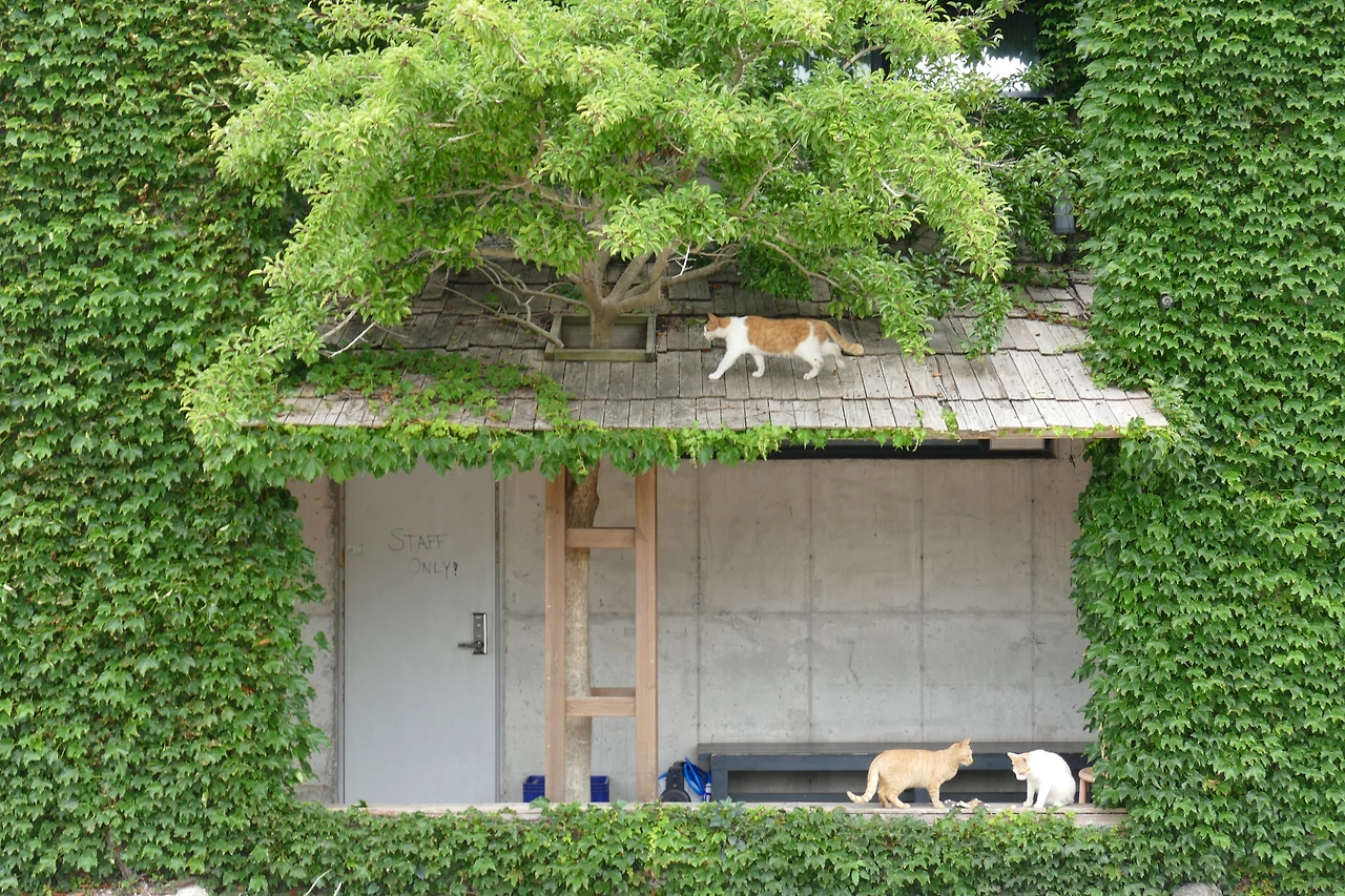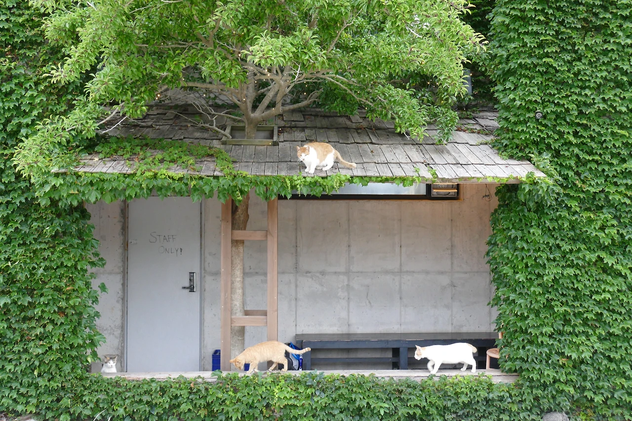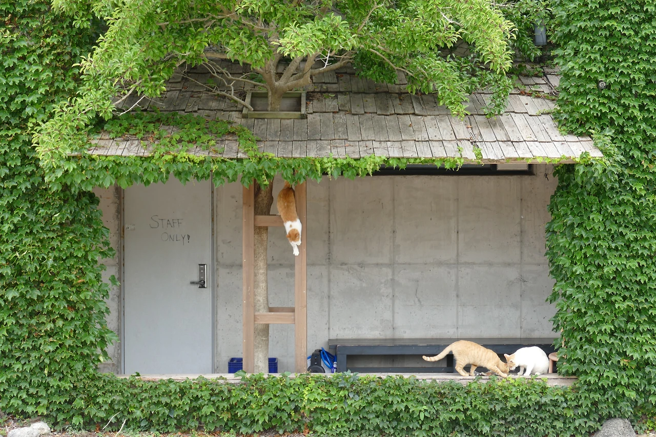 그러다 몇 발짝 물러서 인사를 건네려는 순간, 눈앞에 전혀 다른 풍경이 펼쳐졌다. 건물 전체를 휘감은 초록 덩굴, 그 안에 뚫린 네모난 창처럼 열린 공간 속에서 고양이들이 오르내리고 있었다. 지붕 위로 뛰어올라 가지를 타는 고양이, 계단 아래로 내려섰다가 다시 튀어 오르는 고양이, 덩굴 사이에서 고개를 불쑥 내미는 고양이…. 저마다의 동선을 주고받는 모습은 한 편의 연극 같았다. 무대 위에서 제 몫의 장면을 살아내는 배우들처럼, 고양이들은 그 초록 무대의 주인이었다. 멀찍이서 바라보니 비로소 선명해졌다. 오래된 동화 속 요정의 집 같기도 하고, 앨리스가 작은 문을 열고 맞닥뜨린 다른 세계 같기도 했다. 빛과 바람, 덩굴과 고양이들이 어우러져 현실과 비현실의 경계를 허물고 있었다. 카메라에 담아도 다 옮길 수 없는, 살아 있는 그림 같은 장면.