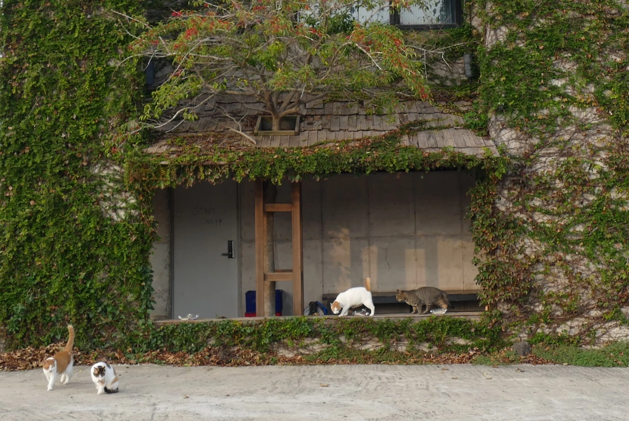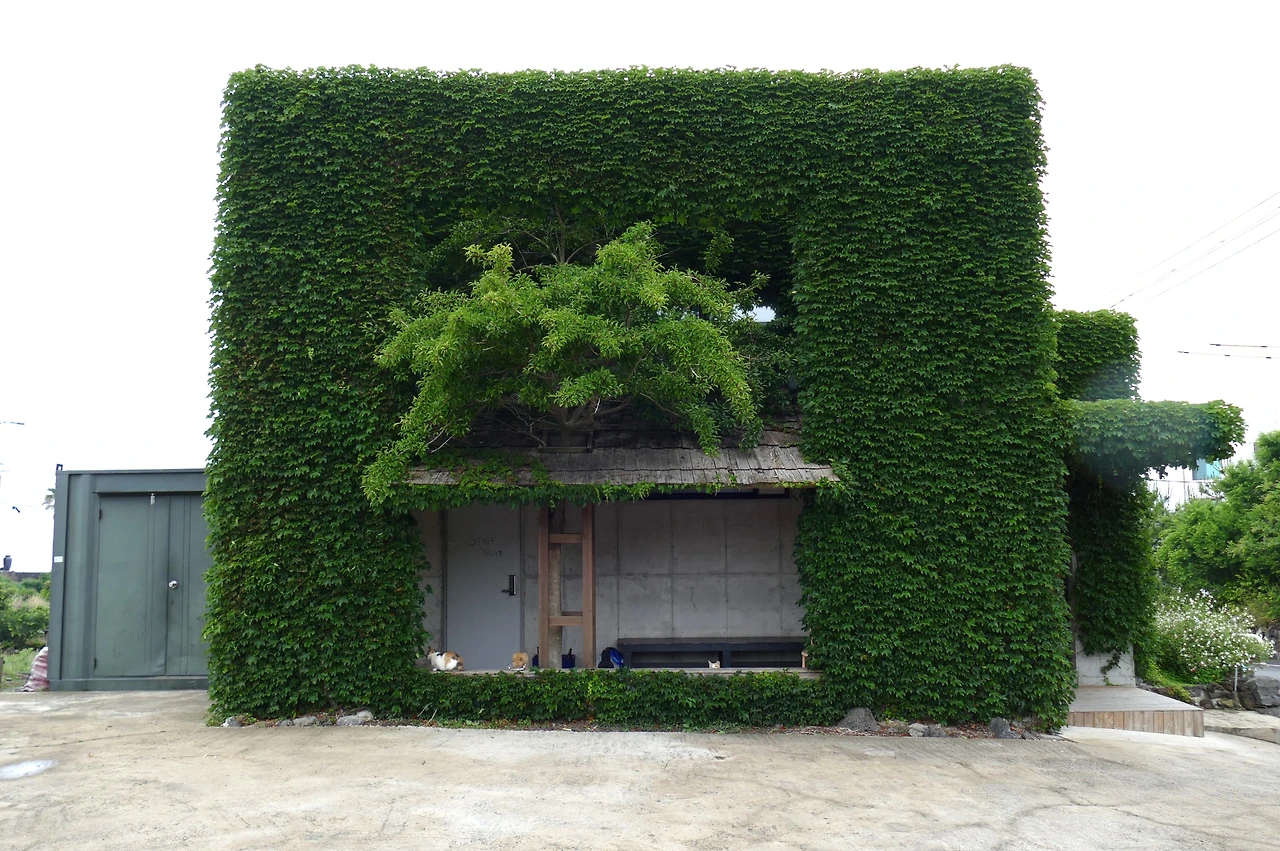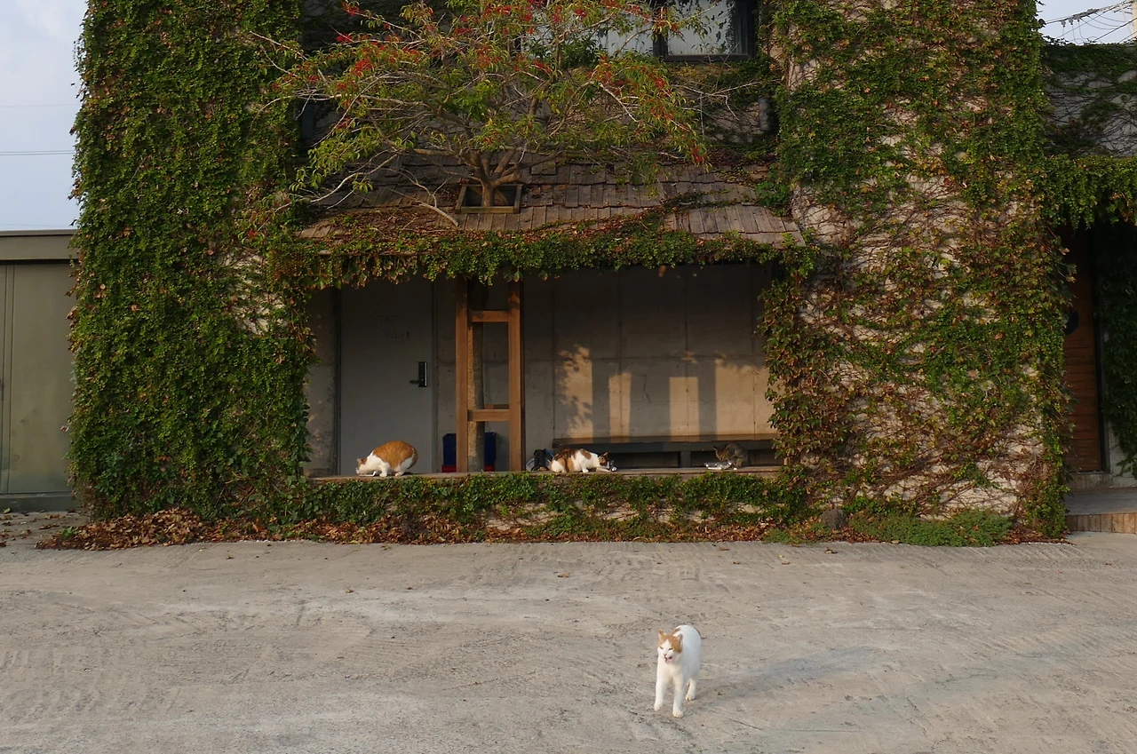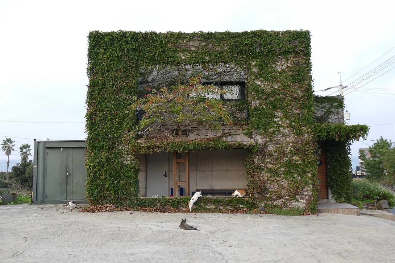 애월은 이제 내게 특별한 장소가 되었다. 삼색이를 만나러 가는 길목에서 언제나 요정건물의 고양이들도 함께 마주하기 때문이다. 초록 덩굴에 둘러싸인 건물은 계절마다 다른 장면을 보여주었다. 여름의 짙은 초록, 가을의 붉은 물결, 겨울의 앙상한 가지와 그 위를 오르내리는 고양이들. 그 풍경은 늘 새로운 연극 무대 같았다. 덩굴은 계절의 변화를 기록했고, 그 안에서 살아가는 고양이들의 모습은 한 폭의 계절화가 되었다.