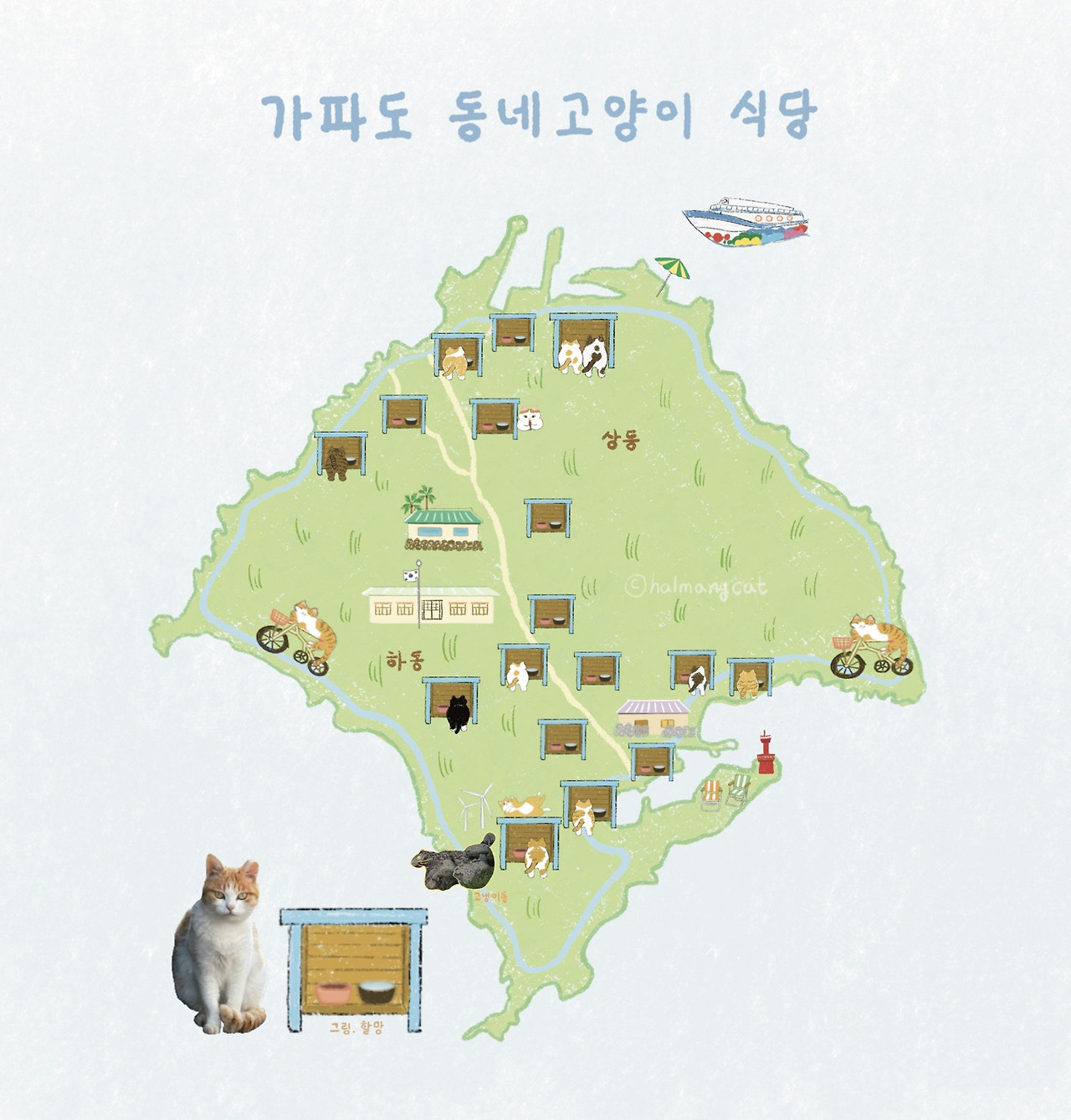 요즘 가파도는 ‘고양이섬’이라는 별칭이 더 익숙할 만큼 풍경이 달라졌다. 섬에 사는 사람보다 고양이가 많고, 사람 손님을 맞는 식당보다 고양이 손님이 들르는 급식소, 이른바 ‘고양이 식당’이 더 많아졌기 때문이다. 가뭄 끝에 내린 단비처럼 생겨난 고양이 식당은 고양이들에게 쉼터가 되어주었고, 섬은 점점 사람과 고양이가 함께 살아가는 따뜻한 터전으로 변모해갔다.