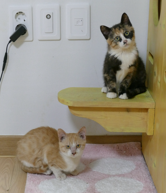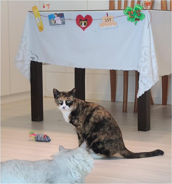 구조된 지 두 달 남짓, 아이들은 이제 제법 안정을 찾아가고 있었다. 허피스와 곰팡이 피부병을 이겨낸 두 고양이는 어느새 또렷한 이목구비와 호기심을 되찾아가고 있었다. 조천이는 먼저 나와 장난감에 코를 대고 킁킁거렸고, 겁 많던 숨비도 호기심을 이기지 못하고 살금살금 다가와 함께 놀기 시작했다. 낯선 사람에 대한 경계보다는 놀이에 집중하는 모습은, 이곳이 이제 제법 익숙해졌다는 뜻이었다.