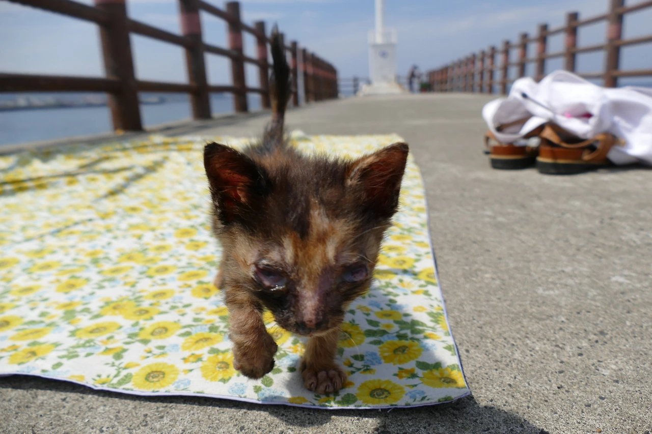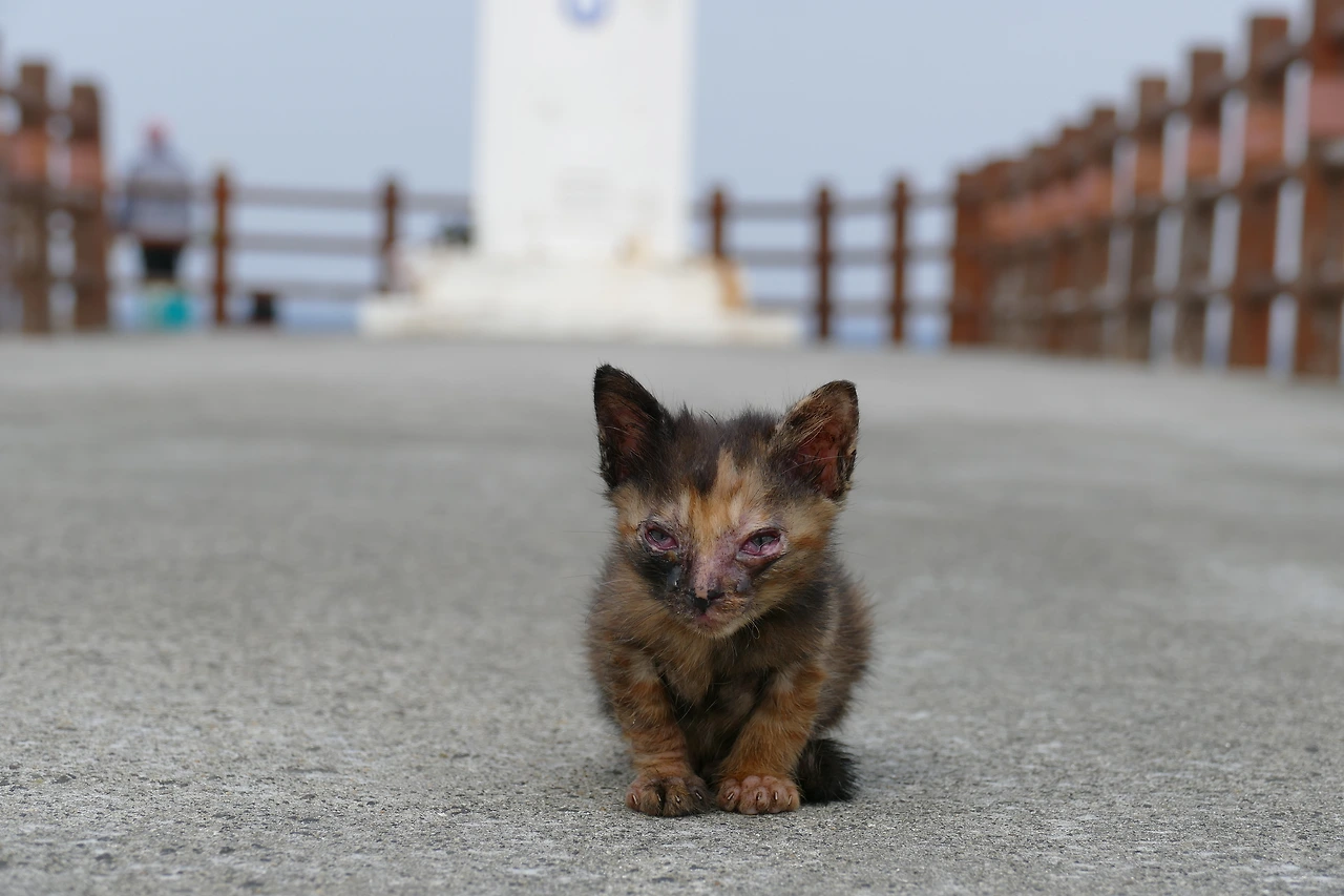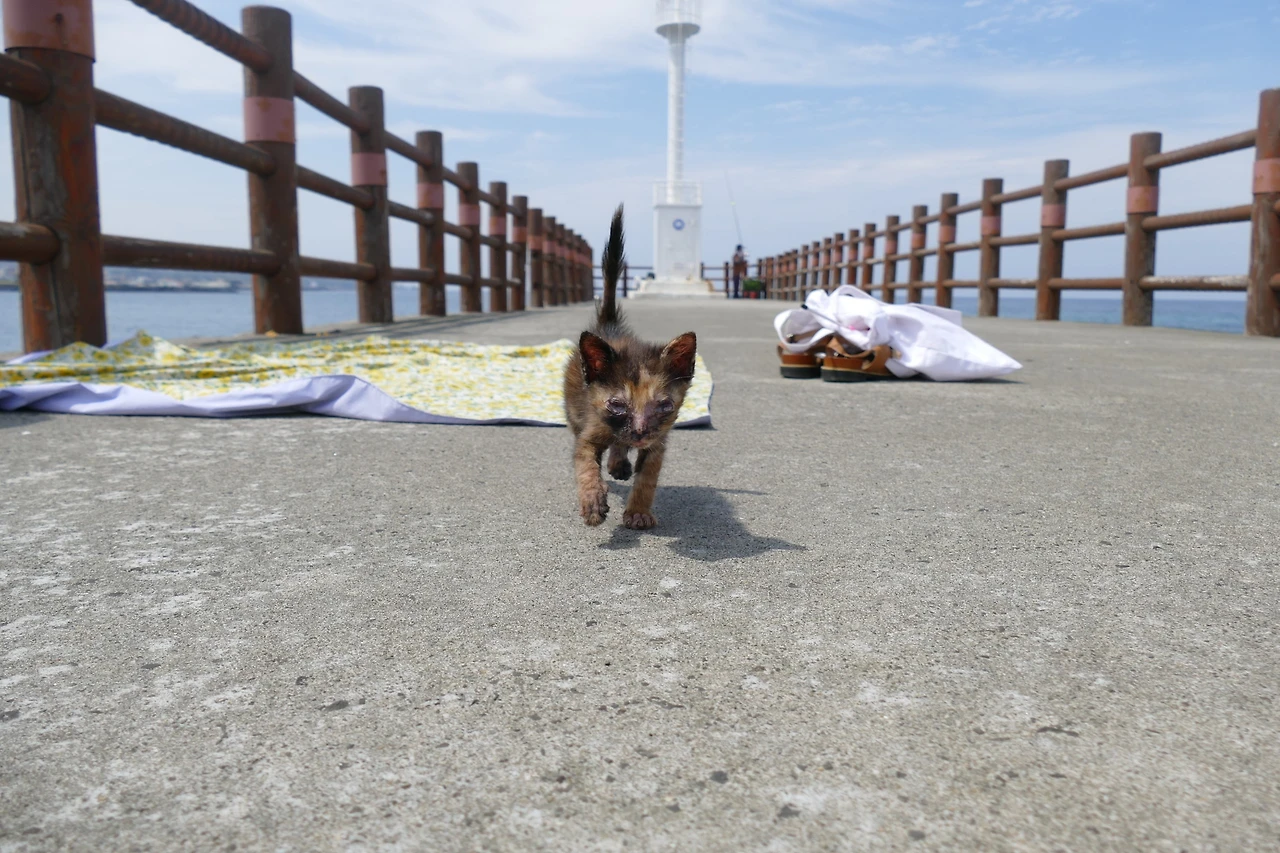 바위에 웅크리고 있던 아기의 눈동자가 나를 향했다. 한층 더 짓무른 눈, 흐릿한 초점, 그 안엔 무언가를 꼭 붙잡고 싶은 마음이 희미하게 맺혀 있었다. 아기는 한참을 망설이다가 마침내 방파제 위로 천천히 올라왔다. 숟가락에 섞은 영양제 습식을 건네자, 주저 없이 받아먹었고, 안약을 넣을 때도 도망치지 않았다. 어미는 오지 않았고, 아기 역시 어미를 찾아 나아가려는 기색은 없었다. 내 곁에 기대듯 머물며, 작고 조용한 체념 같은 시간이 흘렀다.