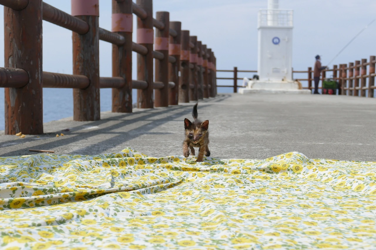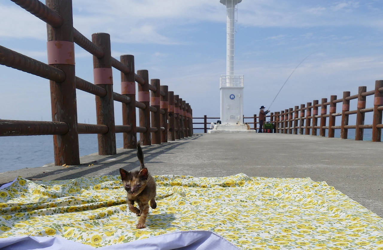아기가 모습을 드러낸 후, 고개를 돌려 방파제 끝을 바라보았다. 등대 옆, 낚시꾼 뒤편에서 익숙한 실루엣이 눈에 들어왔다. 어미 고양이였다. 그 곁엔 먼저 태어난 두 아기 형제가 나란히 몸을 기대고 있었다. 하지만 막내 아기는 보이지 않았다. 바위 안 어딘가에, 혹은 이 방파제 어딘가에 아직 숨은 채 남아 있기를 바랄 뿐이었다.