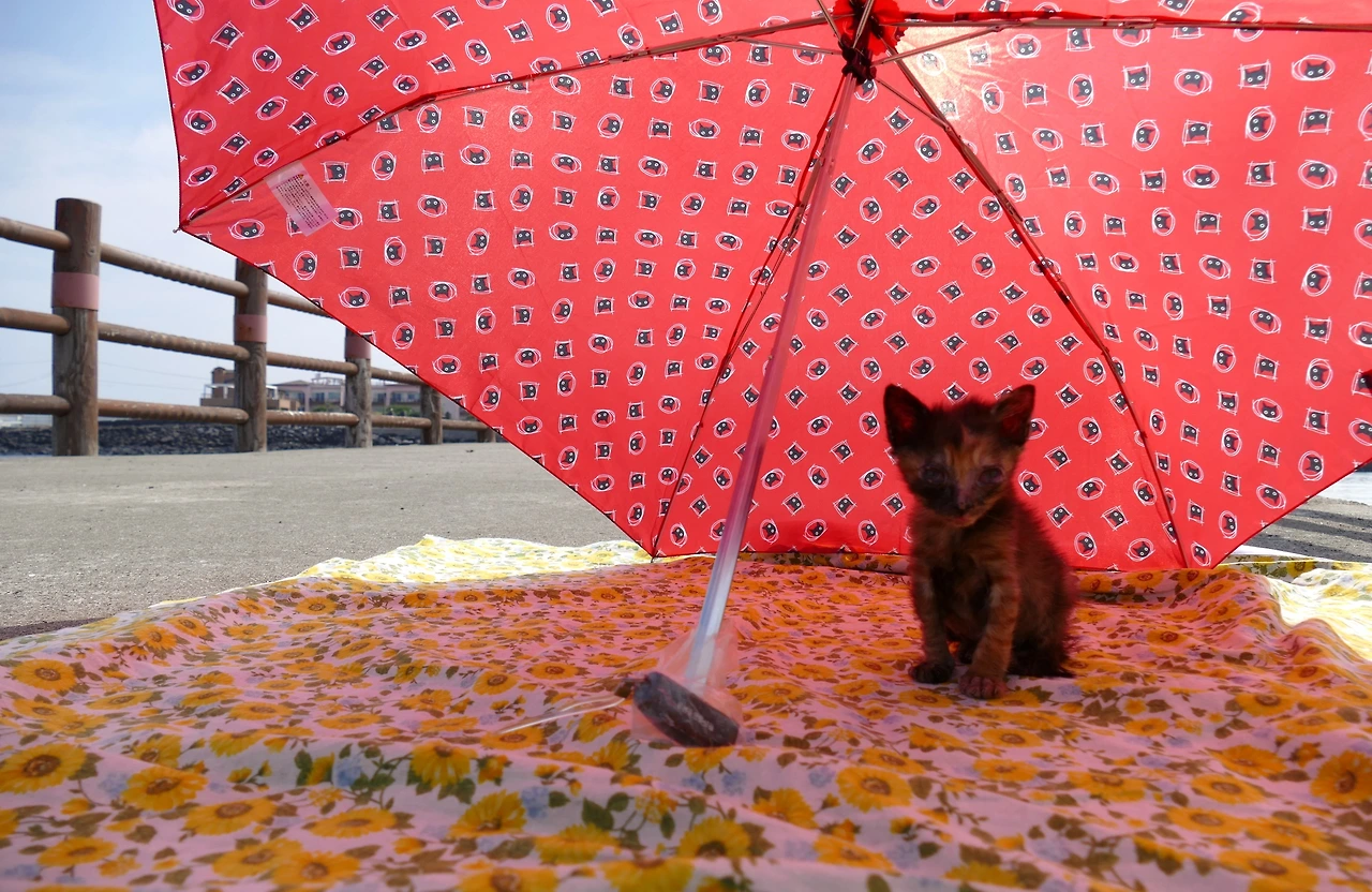 아기가 걱정되어 우산을 펼쳐주자, 망설임 없이 그 아래로 쏙 들어왔다. 다시 다가가자, 이번엔 치맛자락 아래로 달려와 몸을 눕혔다. 잠시 깼다가, 또 달려오고, 다시 치마 아래로 파고드는 작은 몸. 아기는 그렇게 나를 따라다니며 움직였다.