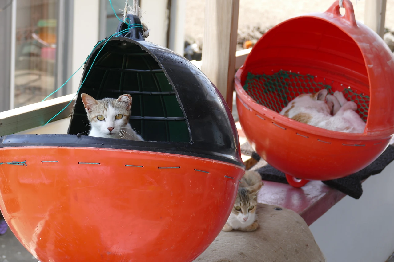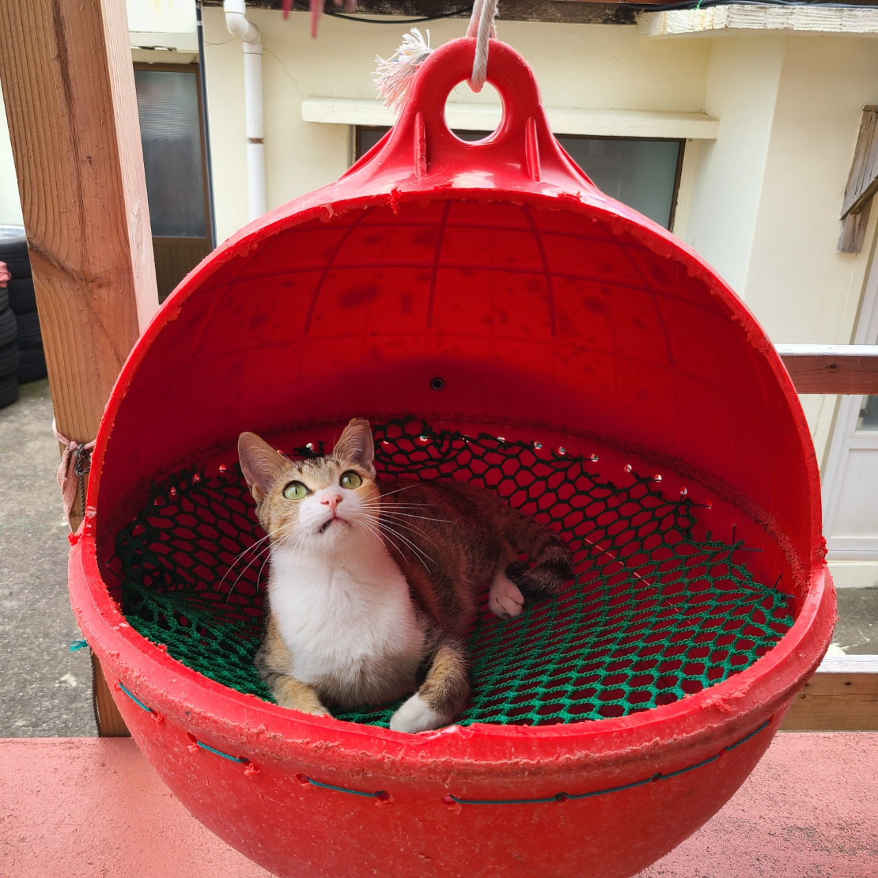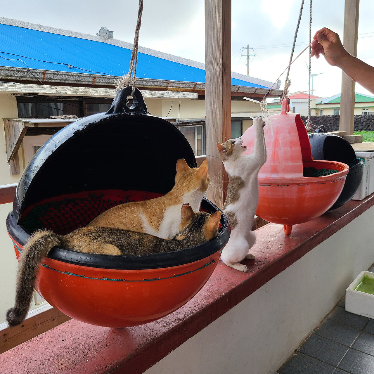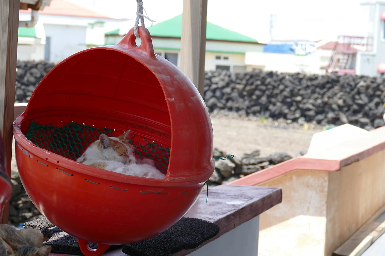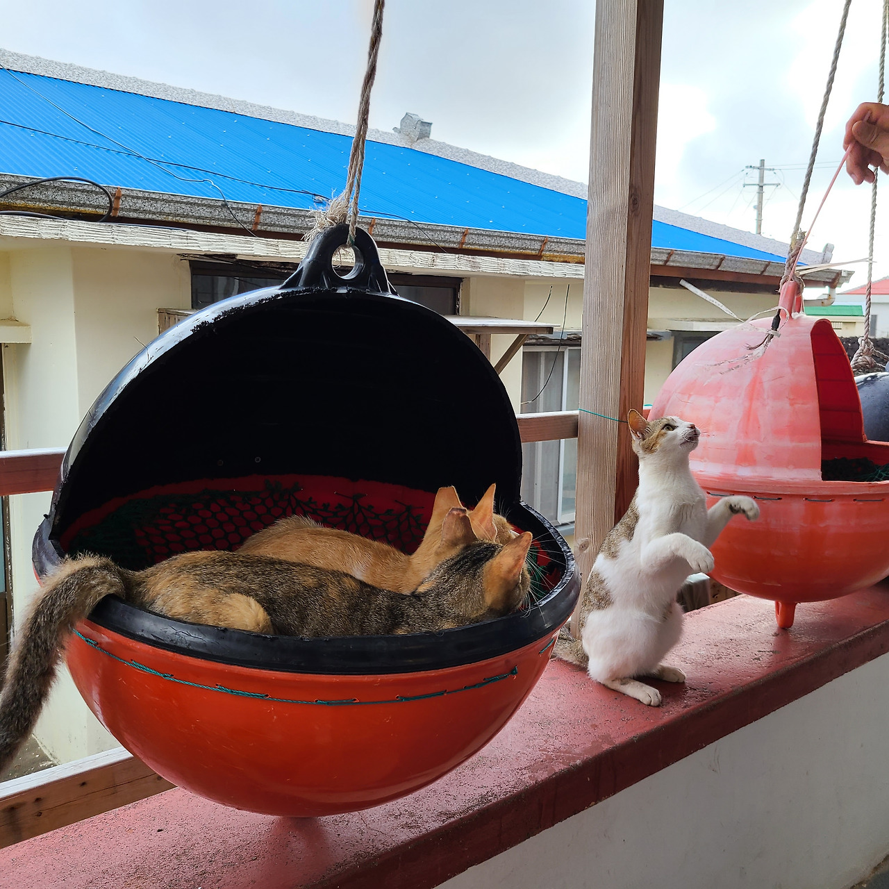 단단한 주황색 플라스틱 테왁. 마치 해녀들이 바다 위에 띄우는 부표 같았다. 하지만 이건 단순한 부표가 아니었다. 누군가 둥근 테왁을 자르고, 안쪽에 초록빛 그물망을 팽팽하게 꿰어 넣어, 고양이 한 마리가 넉넉히 누울 수 있는 해먹을 만들어 놓았다.