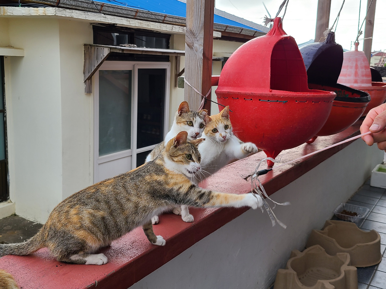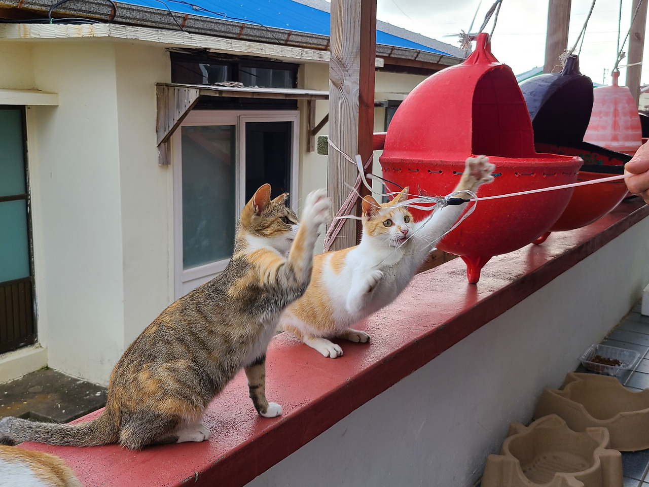 말과 함께 장난감 끝을 흔들기 시작하자, 구경하던 고양이들이 하나둘씩 달려들었다.