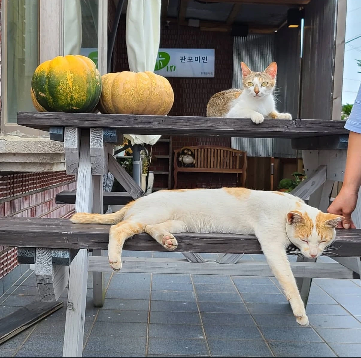 식당 정문 앞에서는 고양이들이 손님을 맞이하곤 했다. 나무 테이블 위에 누워 손님을 구경하거나, 신발장 아래 몸을 숨긴 채 지나가는 발소리를 살폈다. 사장님은 마당고양이들이지만 모두에게 보호받고 있다는 것을 알리기 위해, 한 마리 한 마리 직접 뜨개질한 목걸이를 걸어주셨다.