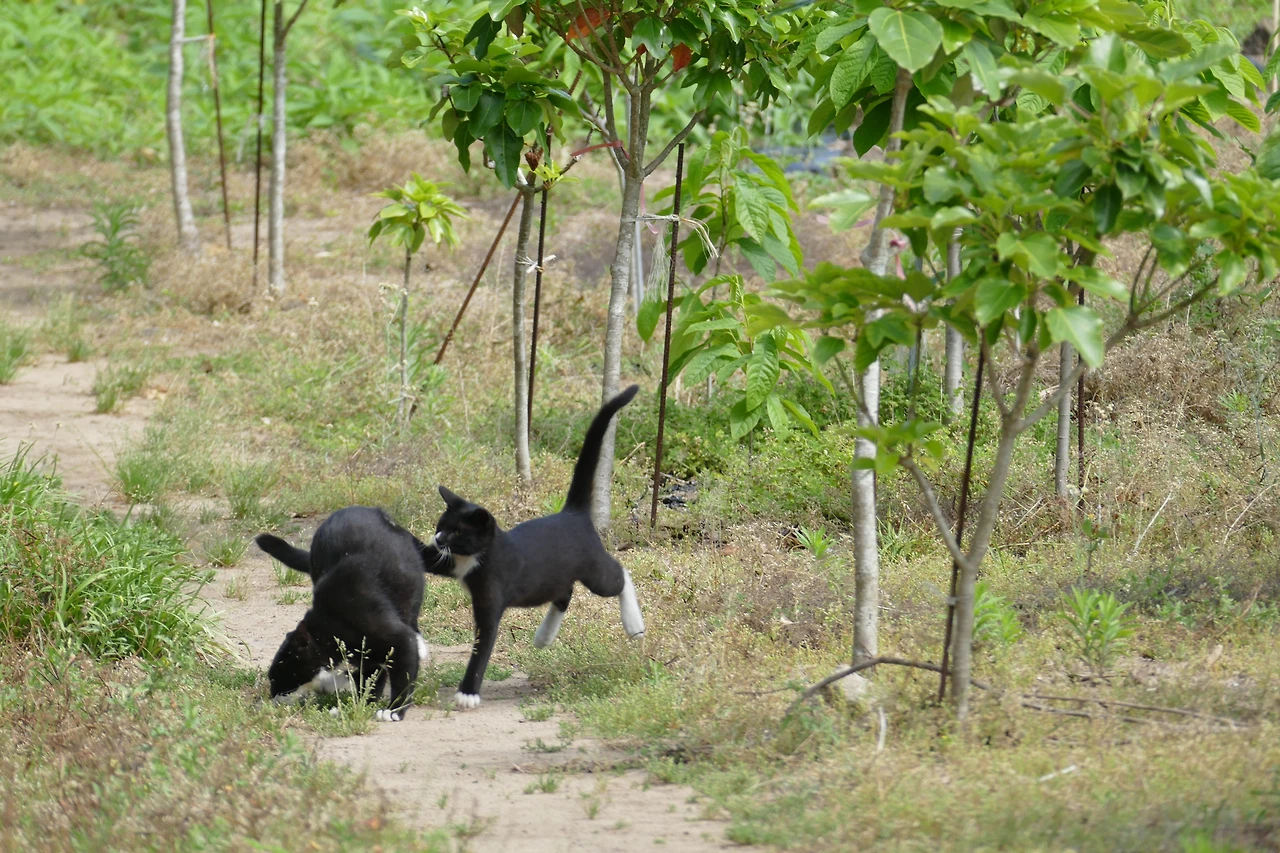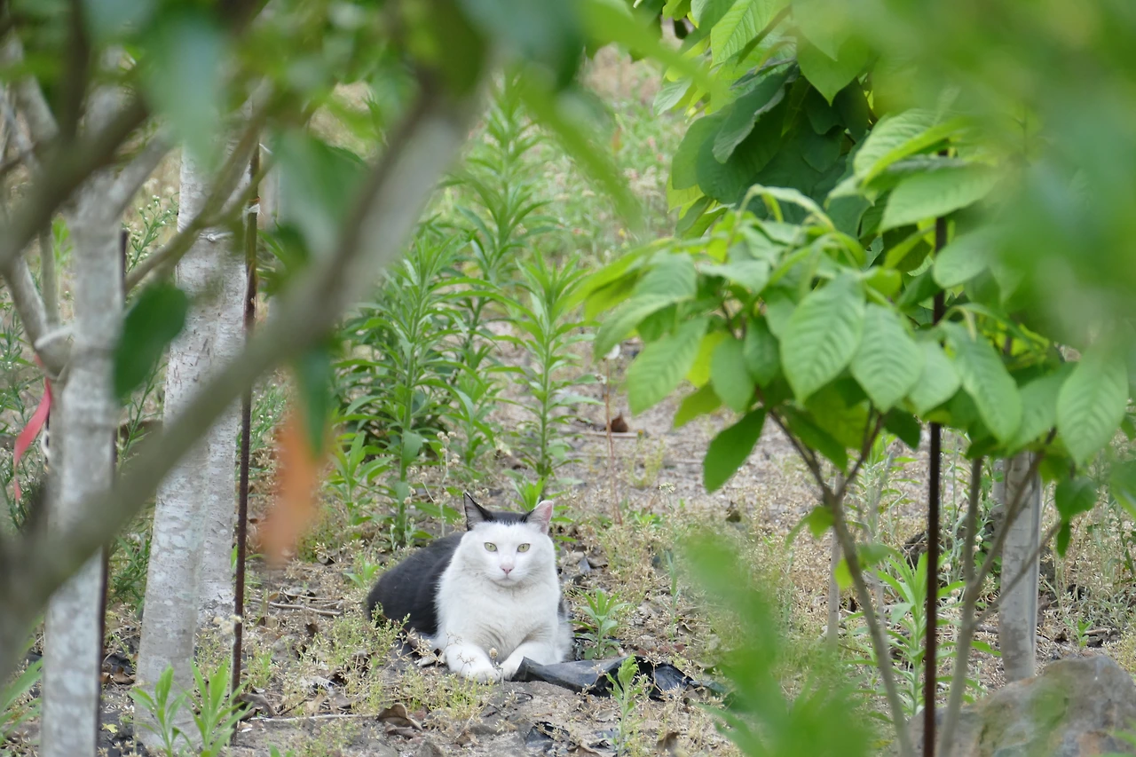 그를 보고 싶어 시간을 맞춰 식당을 찾은 날, 마델이는 식당 옆 귤밭 그늘에서 조용히 쉬고 있었다. 햇살이 부드럽게 내려앉은 풍경 속에서 다른 고양이들도 엎치락뒤치락 장난을 치며 어울려 놀고 있었다. 풀잎 사이로 튀어 오르는 꼬리, 흙바닥을 굴러다니는 몸짓까지. 그 자체로 작은 축제 같았다.