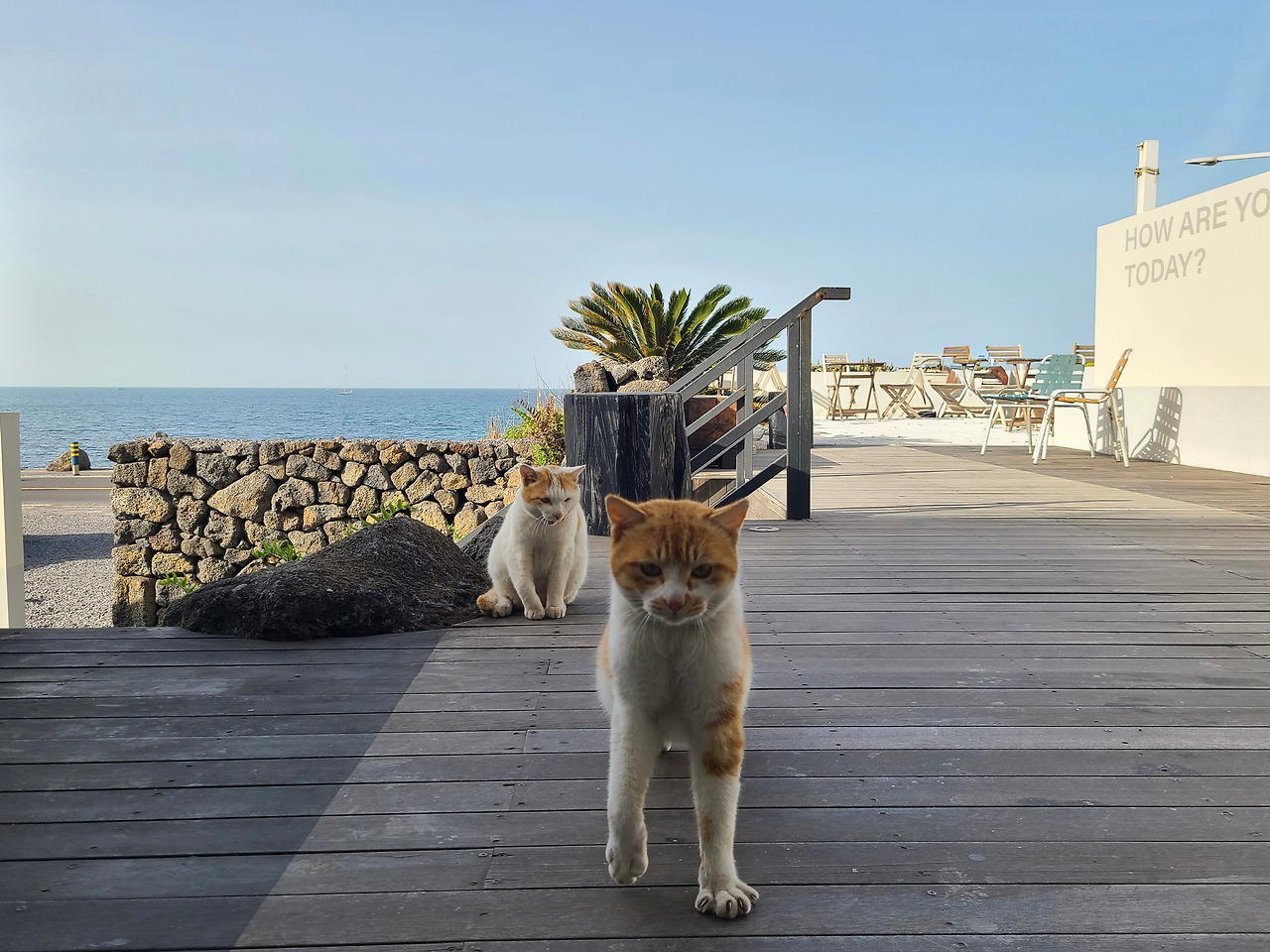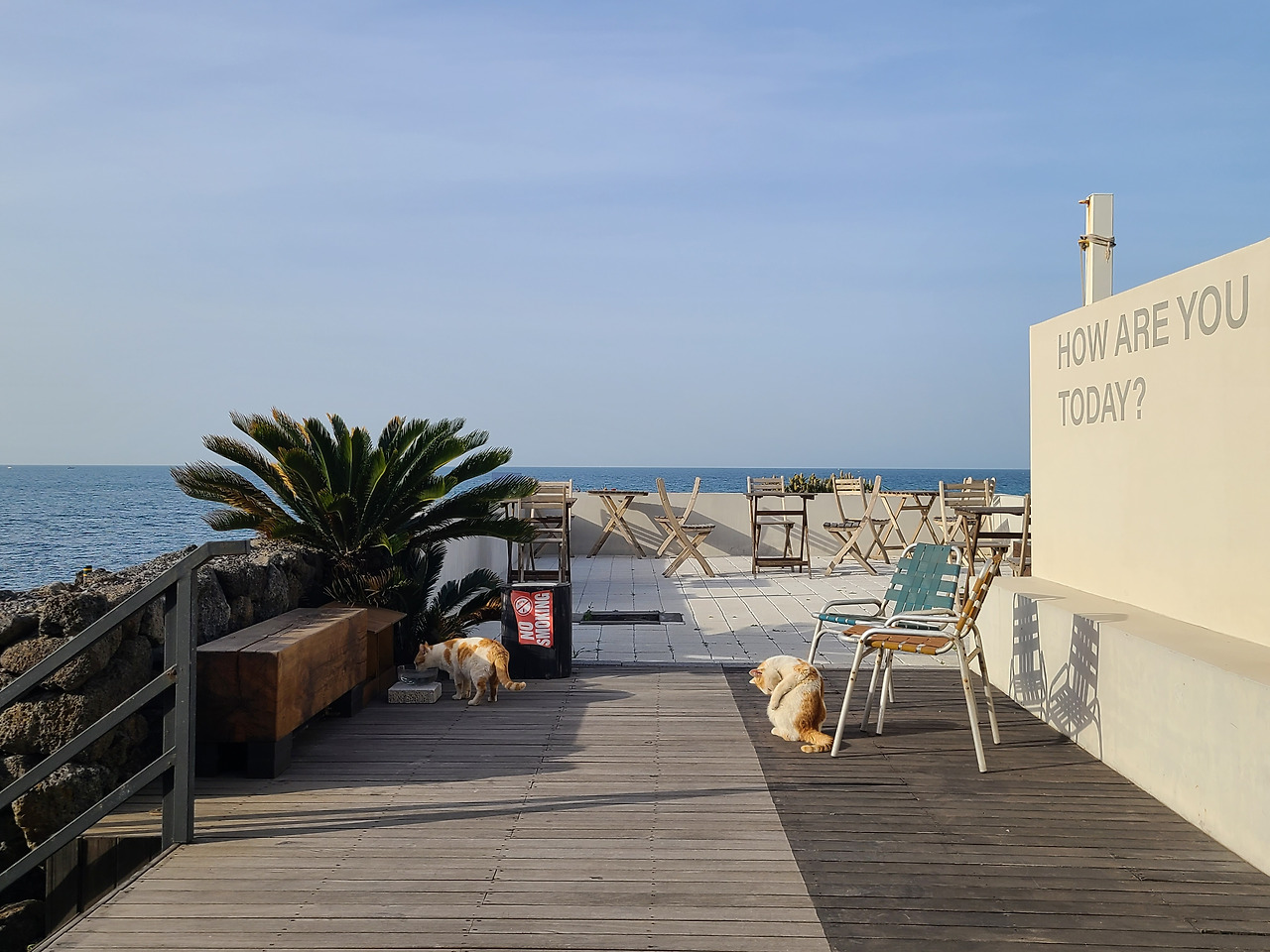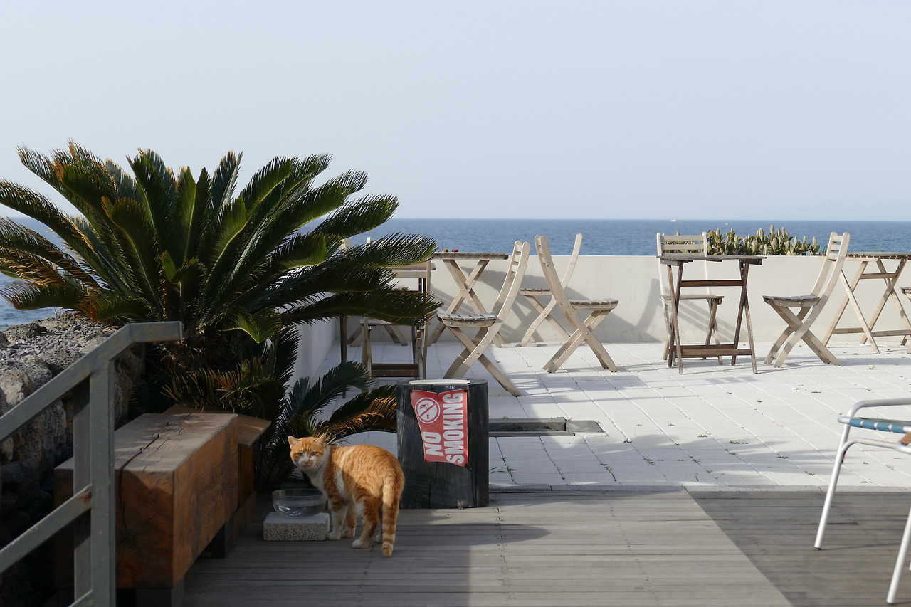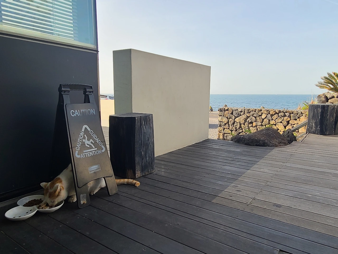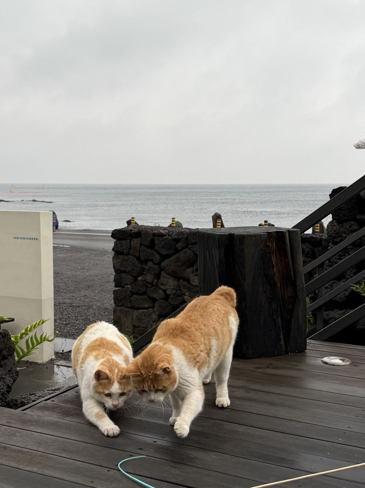 안내문 앞에는 고양이들이 자주 머물렀다. 처음엔 이유를 알지 못했지만, 고양이가 앉아 있던 돌 틈은 데크 아래로 이어지는 통로였다. 아이들은 그곳에서 몸을 숨기고 쉬다가, 다시 나와 바다 앞 공간을 오르내렸다. 안내문은 몇 마디 글에 그치지 않고, 고양이들의 삶이 스며 있는 자리에서 살아 움직이는 표식 같았다. 그 문장은 이곳을 설명하는 가장 확실한 언어였다. 고양이와 함께 살아가는 공간임을, 그리고 그 사실을 받아들이지 못하는 사람은 발길을 돌릴 수도 있음을. 나는 그 언어가 곧 이 풍경과 삶을 지켜내는 힘이라는 걸 알 수 있었다.