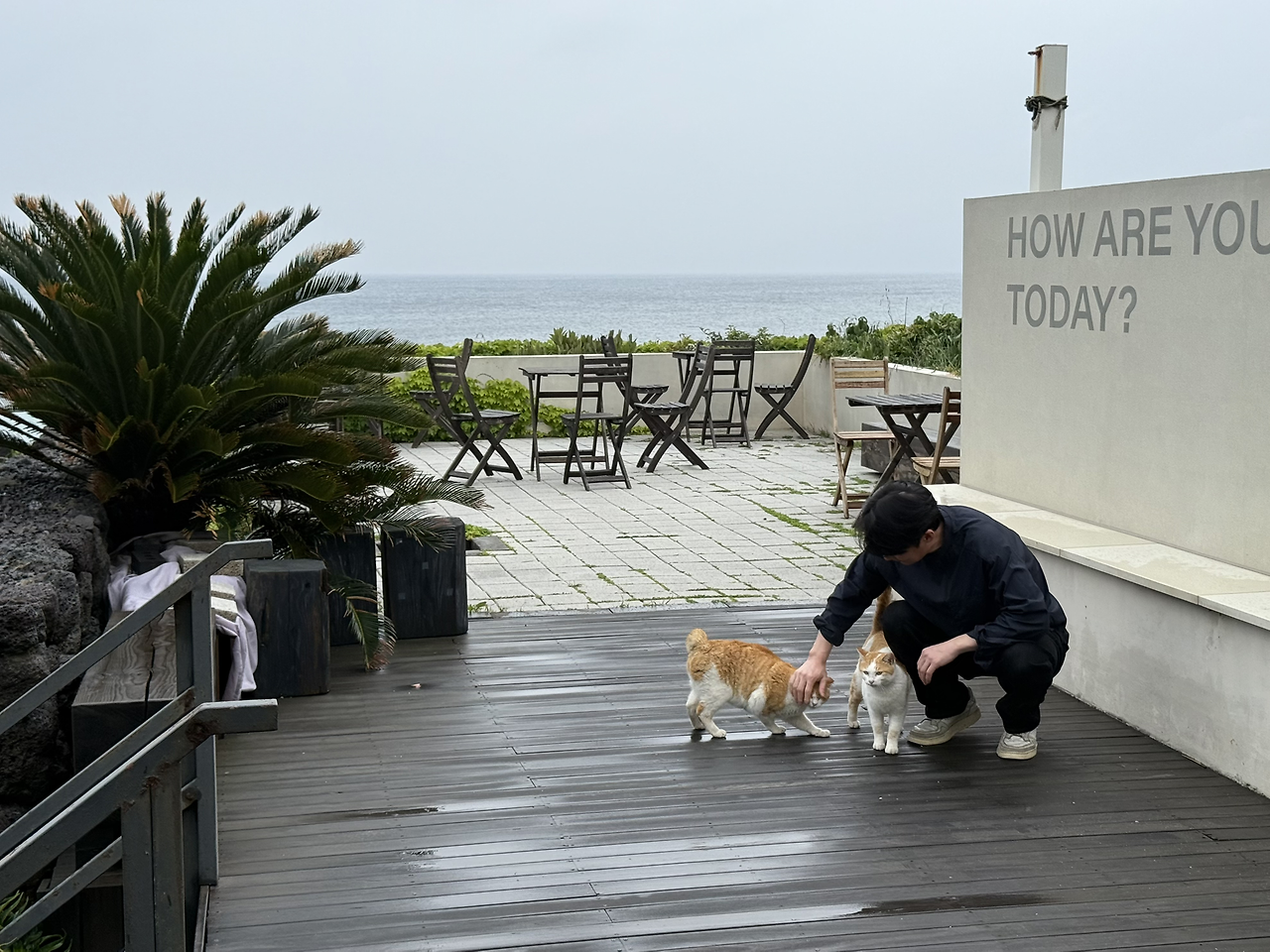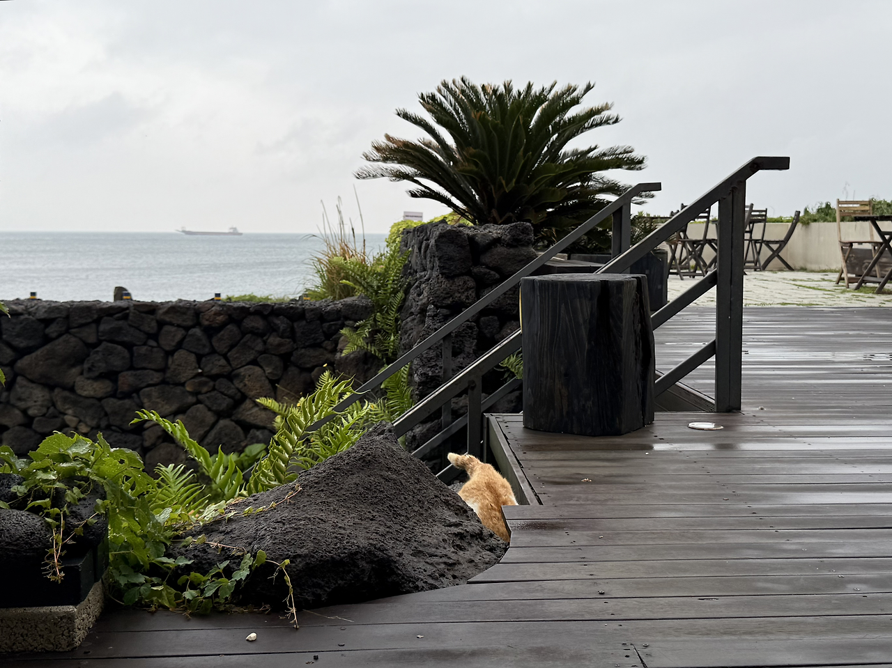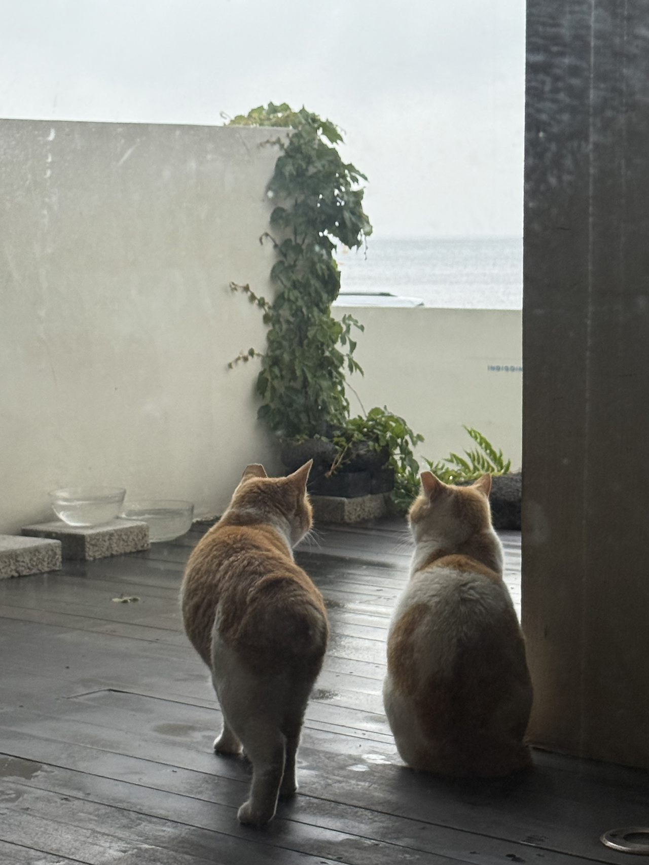 맑은 날엔 햇살 아래서 느긋하게 잠들던 아이들이었지만, 비가 내리자 풍경은 달라졌다. 사장님은 “아마 데크 아래에서 쉬고 있을 것”이라 일러주었다. 실제로 엄마 품에서 태어난 그 자리는 지금도 아이들의 잠자리가 되어 있었다. 빗방울을 피해 옮겨놓은 밥그릇은 카페 유리문 앞에 놓였고, 투명한 유리를 사이에 두고 밥을 먹는 아이들을 바라보니, 파도와 빗소리 사이로 작은 씹는 소리가 은은히 스며들었다. 특별할 것 없는 장면이었지만, 그 고요는 빗속의 풍경을 한층 더 따뜻하게 물들이고 있었다.