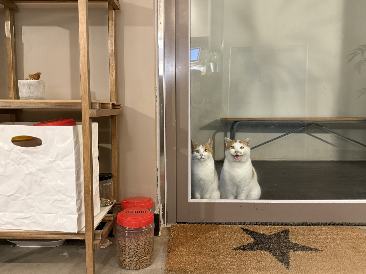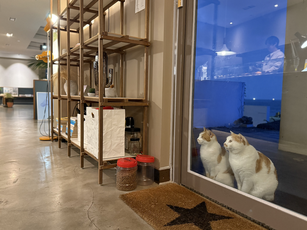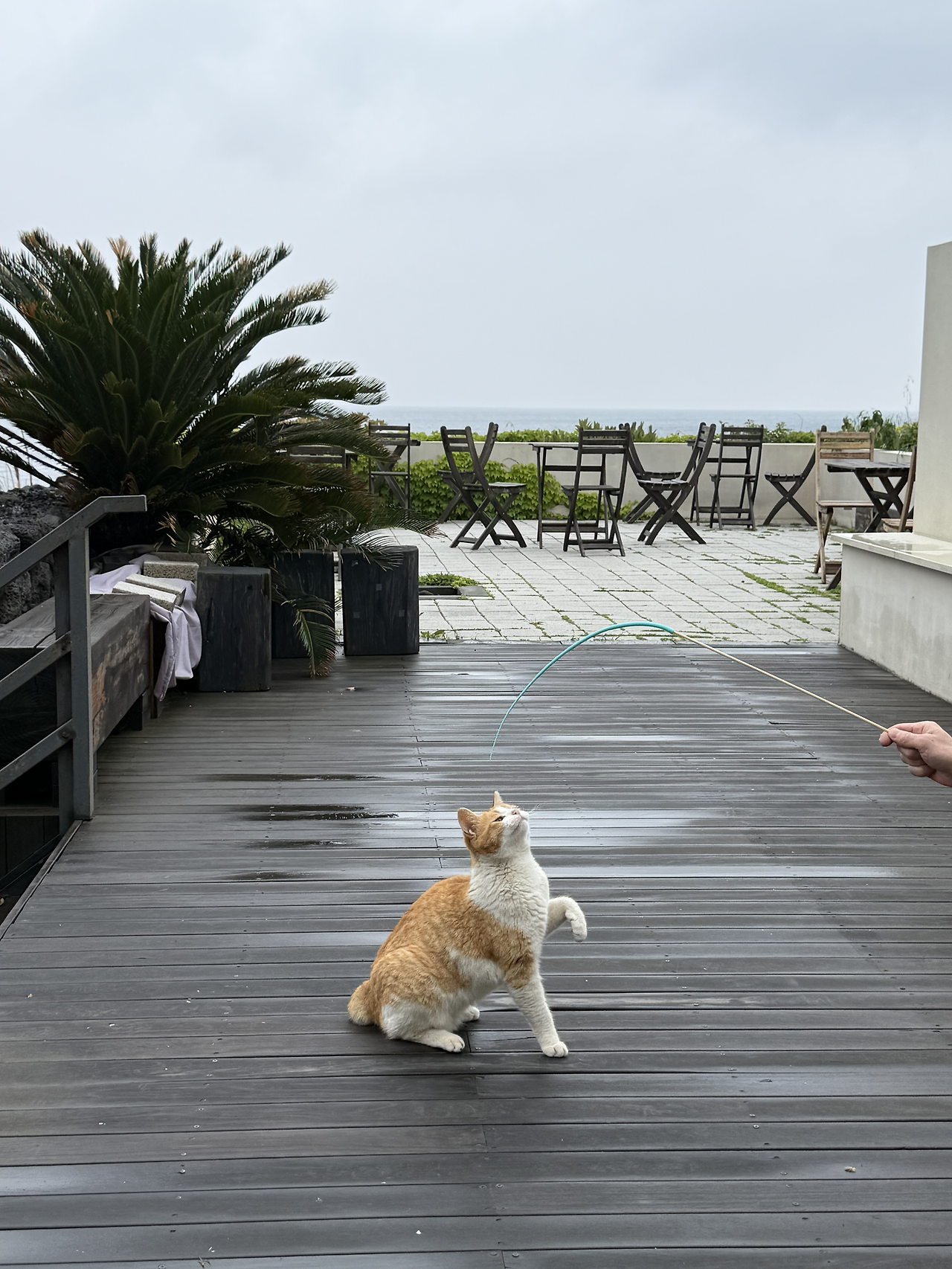 맑은 날엔 햇살 아래서 느긋하게 잠들던 아이들이었지만, 비가 내리자 풍경은 달라졌다. 사장님은 “아마 데크 아래에서 쉬고 있을 것”이라 일러주었다. 실제로 엄마 품에서 태어난 그 자리는 지금도 아이들의 잠자리가 되어 있었다. 빗방울을 피해 옮겨놓은 밥그릇은 카페 유리문 앞에 놓였고, 투명한 유리를 사이에 두고 밥을 먹는 아이들을 바라보니, 파도와 빗소리 사이로 작은 씹는 소리가 은은히 스며들었다. 특별할 것 없는 장면이었지만, 그 고요는 빗속의 풍경을 한층 더 따뜻하게 물들이고 있었다.