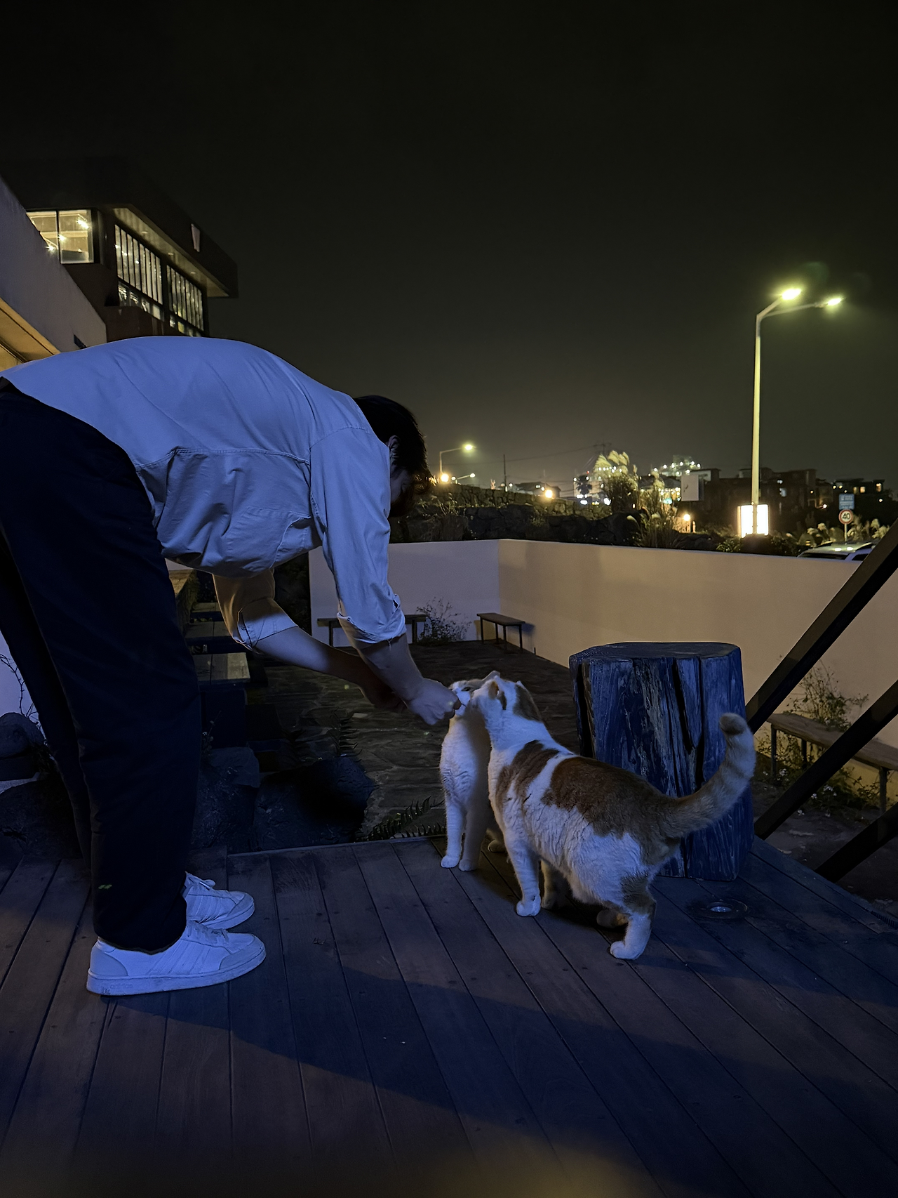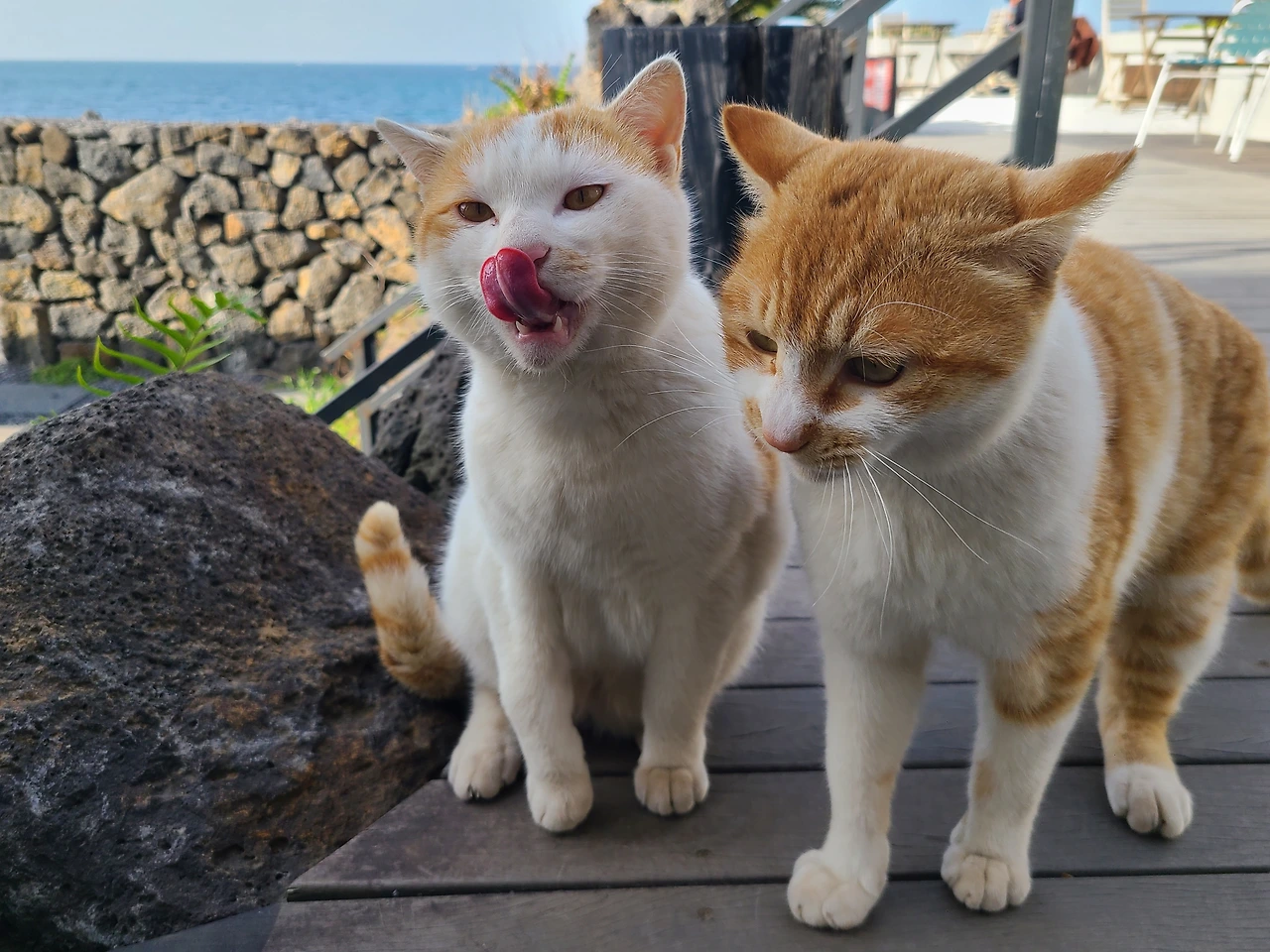 곧 흰 바탕에 치즈빛을 두른 고양이가 고개를 내밀었다. 세 아이가 나란히 모습을 드러내자, 바닷가 풍경은 한층 더 충만해졌다. 주인의 허락을 받아 트릿을 내밀었다. 그러자 멀찍이 거리를 두던 아이들이 조금씩 가까워졌다. 트릿만 받아먹을 뿐, 여전히 적당한 거리를 지키며 살아가는 고양이들이었다.