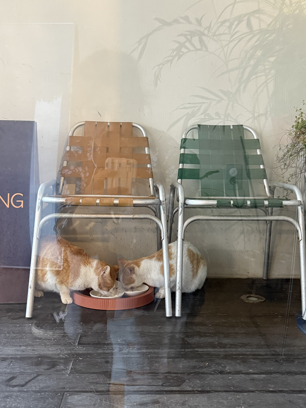 창밖을 기웃거리며 기다리던 끝에, 고양이가 나타났다. 간판 안쪽 그늘에 몸을 웅크린 채, 조용히 사료 그릇에 고개를 묻고 있었다.