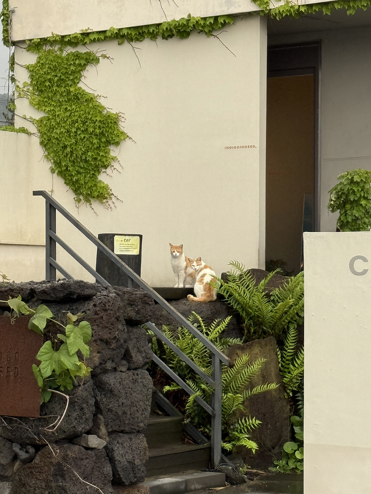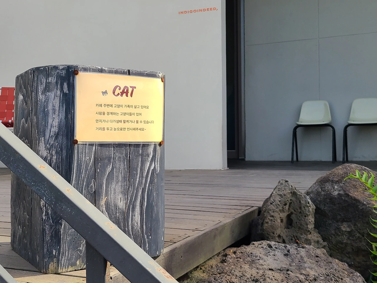 입구에서 가장 먼저 눈에 들어온 것은 작은 안내문이었다. ‘CAT’이라는 굵은 글씨 아래에는 고양이 가족이 이곳에 살고 있으며, 사람을 경계하기에 거리를 두고 바라봐 달라는 문장이 적혀 있었다. 그것은 소박한 안내문이었지만, 고양이와 사람이 모두 불편하지 않도록 서로의 거리를 존중해 달라는 다정한 언어처럼 다가왔다. 그 몇 줄 속에는 이 공간을 오랫동안 지켜온 배려와 신뢰가 담겨 있었다.