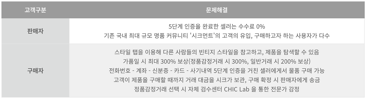 시크는 판매자/구매자 고객의 문제를 각각 아래와 같이 해결합니다.