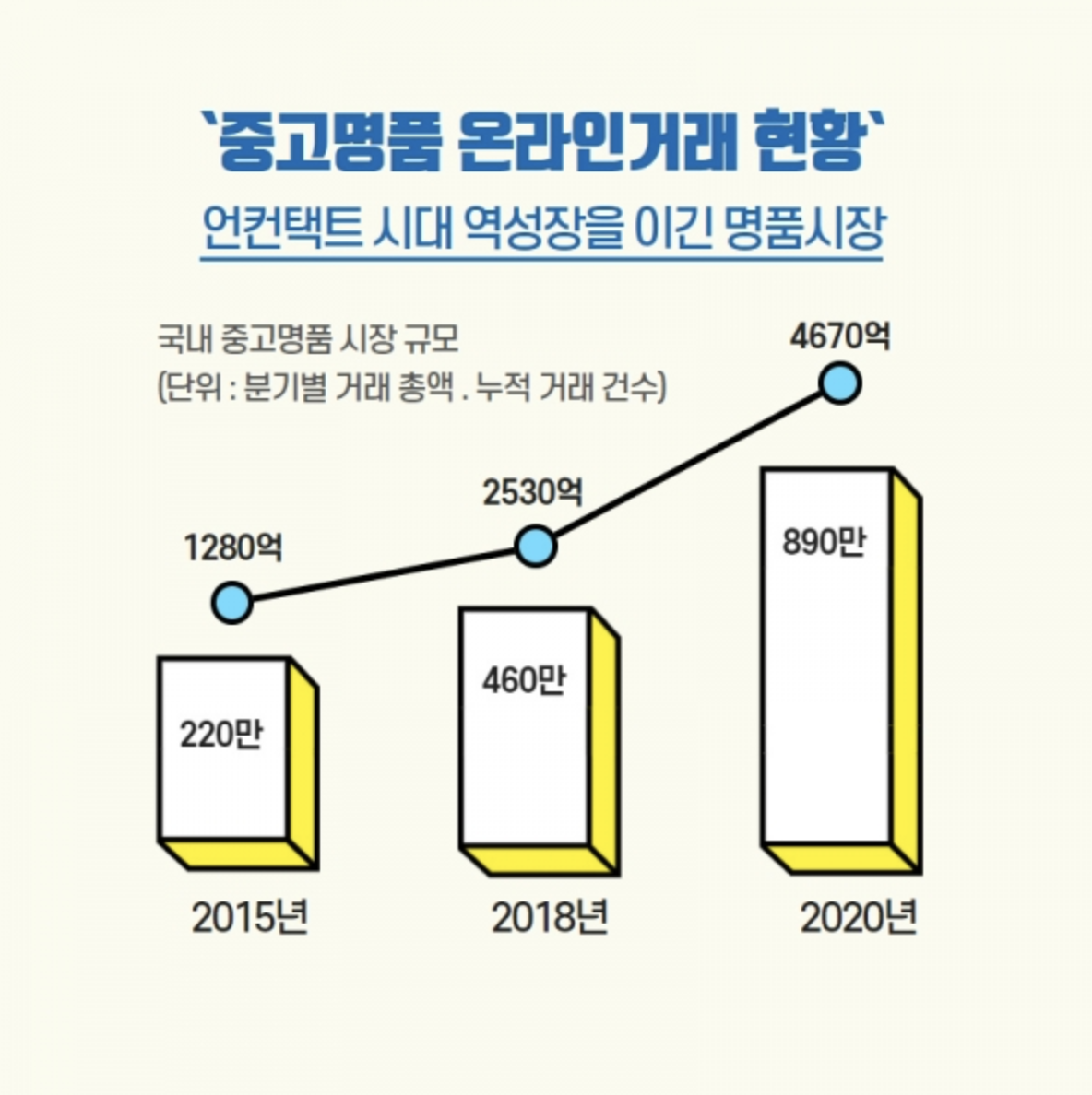 온라인 중고 명품 시장은 '20년 기준 4670억에 달하며 누적 거래 건수는 890만 건에 달합니다. 명품을 소비하는 연령대가 갈수록 낮아지고, 최근 MZ 사이에서는 중고 명품을 이용해 스타일링을 하는 것이 '힙하고 합리적인' 소비 행위로 통하는 등 디지털 네이티브 세대가 명품 시장에 뛰어들며 전체 명품 시장도, 리셀 시장도 함께 성장할 것으로 예상됩니다. 거래 제품의 가격이 높아짐에 따라 수수료가 높아지기 때문에, 번개장터와 중고나라 등 기존 중고거래 플랫폼도 중고 럭셔리 거래 시장에 뛰어들어 진가품을 판별하는 서비스를 론칭했습니다.