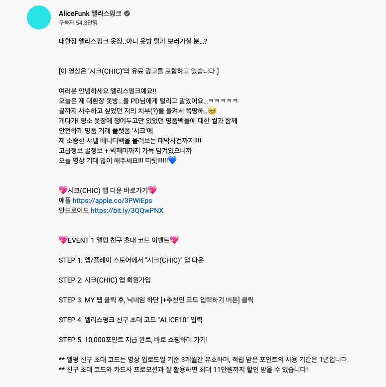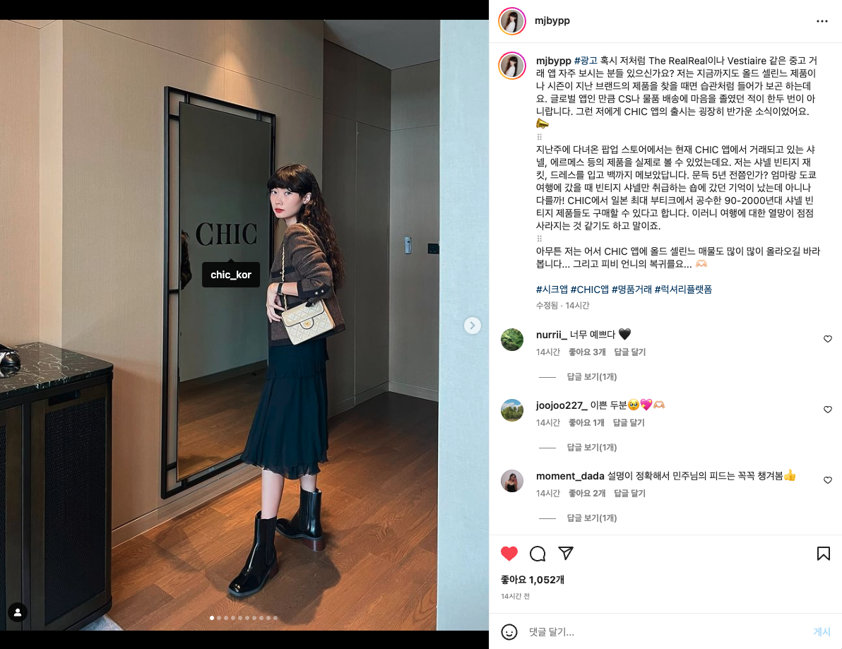 어떤 광고들을 집행하고 있나 살펴봤는데, 인스타그램에서는 일반인 패션 인플루언서를 통한 포스팅 / 유튜브에서는 유료 광고 형태로 시크 이용자를 확보하려는 움직임이 보였습니다. 대규모 마케팅을 집행하지 않는다는 점에서 PMF를 달성했다기보다는 크림과 시크먼트 커뮤니티를 운영했던 노하우로 MVP를 만들고, 그것이 유효한지 확인하려는 단계인 것 같습니다.