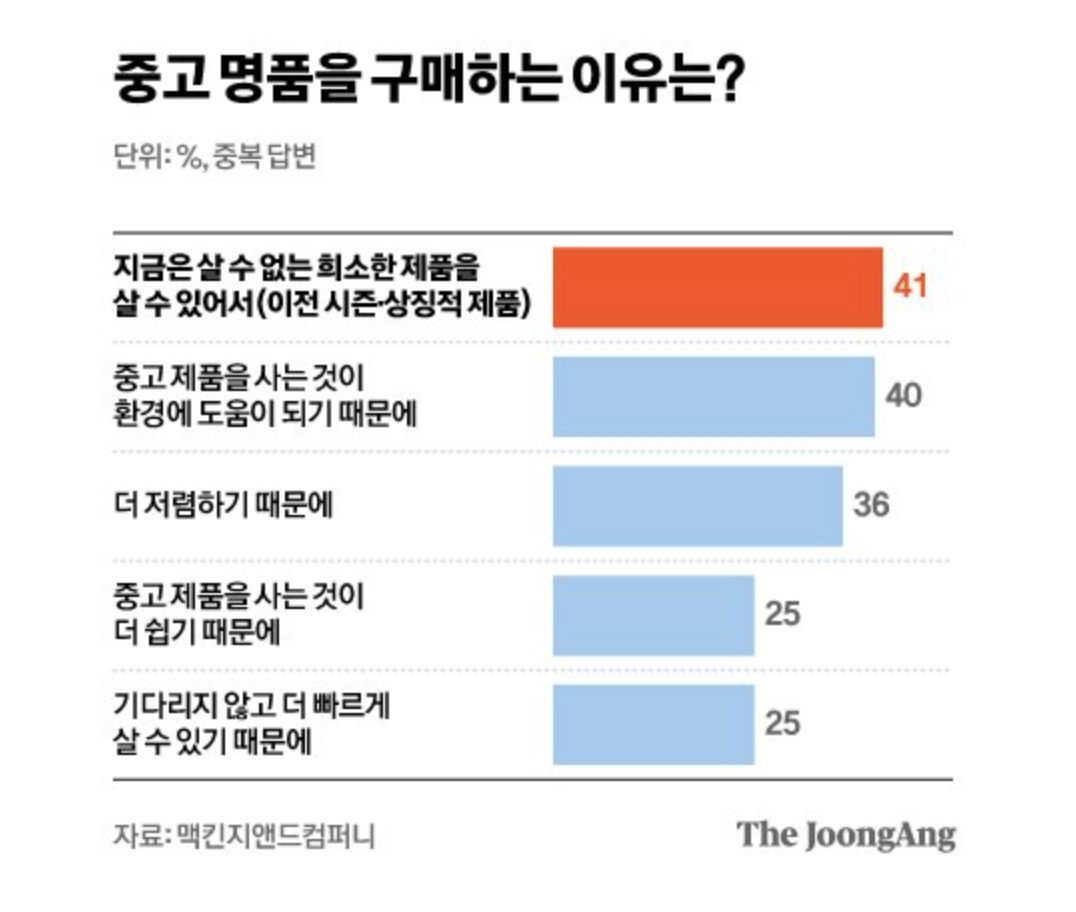 시크의 주요 고객은 '빈티지 럭셔리로 스스로의 유니크한 스타일을 구축하려는 2030 여성'입니다. 동일한 '중고거래'라는 프로세스가 럭셔리 제품에는 어떻게 적용될까요? 사람들은 정말 합리적인 가격으로 명품을 구매하기 위해서 리셀 플랫폼을 이용할까요? 맥킨지애드컴퍼니에서 제공한 '중고 명품을 구매하는 이유는?' 설문조사에 대한 응답 중 가장 높은 비율을 차지하는 답변은 '지금은 살 수 없는 희소한 제품을 살 수 있어서'였습니다.