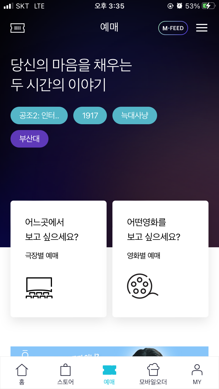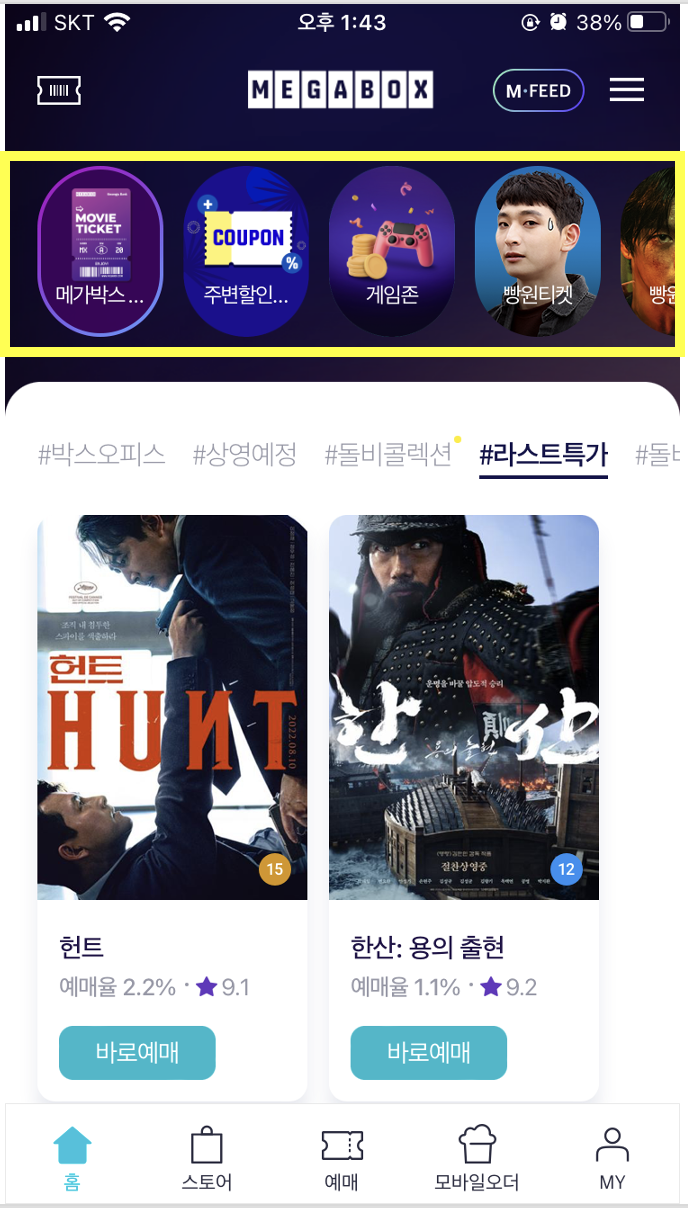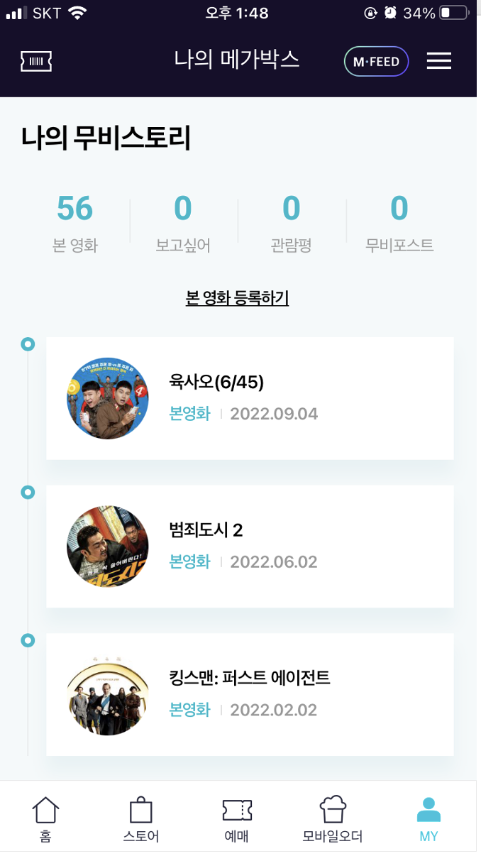 이미지 : 메가박스의 무비피드는 '이번주 박스오피스', '지금 주목받는 영화 한 편' 등 간략하게 영화를 큐레이션해주는 피드임. 메인 화면에서 무비피드를 클릭하면 포스팅들을 확인할 수 있고, 포스팅을 클릭하면 하단에 관련 영화를 예매할 수 있는 방식. 고객으로 하여금 영화를 추천하고, 탐색하고, 예매하도록 유도하는 기능이라 볼 수 있음. 그러나 가장 중요한 예매로 이어지는 페이지에서, 가장 우측 사진과 같이 콘텐츠를 클릭하자마자 포스터 이미지가 화면의 전체를 차지함. 큐레이션 콘텐츠인만큼 콘텐츠의 퀄리티나 화제성, 내용을 한 눈에 볼 수 있도록 설계했으면 좋았겠다는 생각이 들었음. 이미지의 크기가 과도하게 커서 불필요하게 스크롤을 내려야 했음.