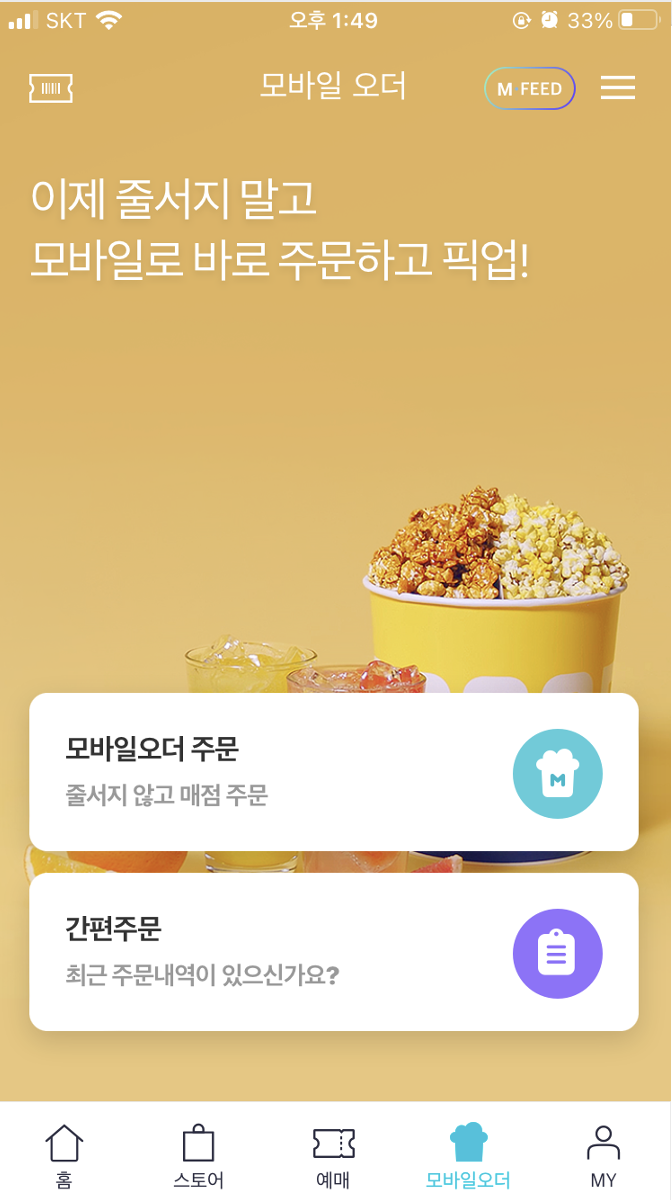 흐름 : 하단 메뉴 중 모바일 오더를 클릭하면 바로 위 화면이 나오고, 해당 화면에서 이미지와 텍스트를 통해 기능에 대한 이해를 도와 모바일 오더 주문으로 이어지게 함.