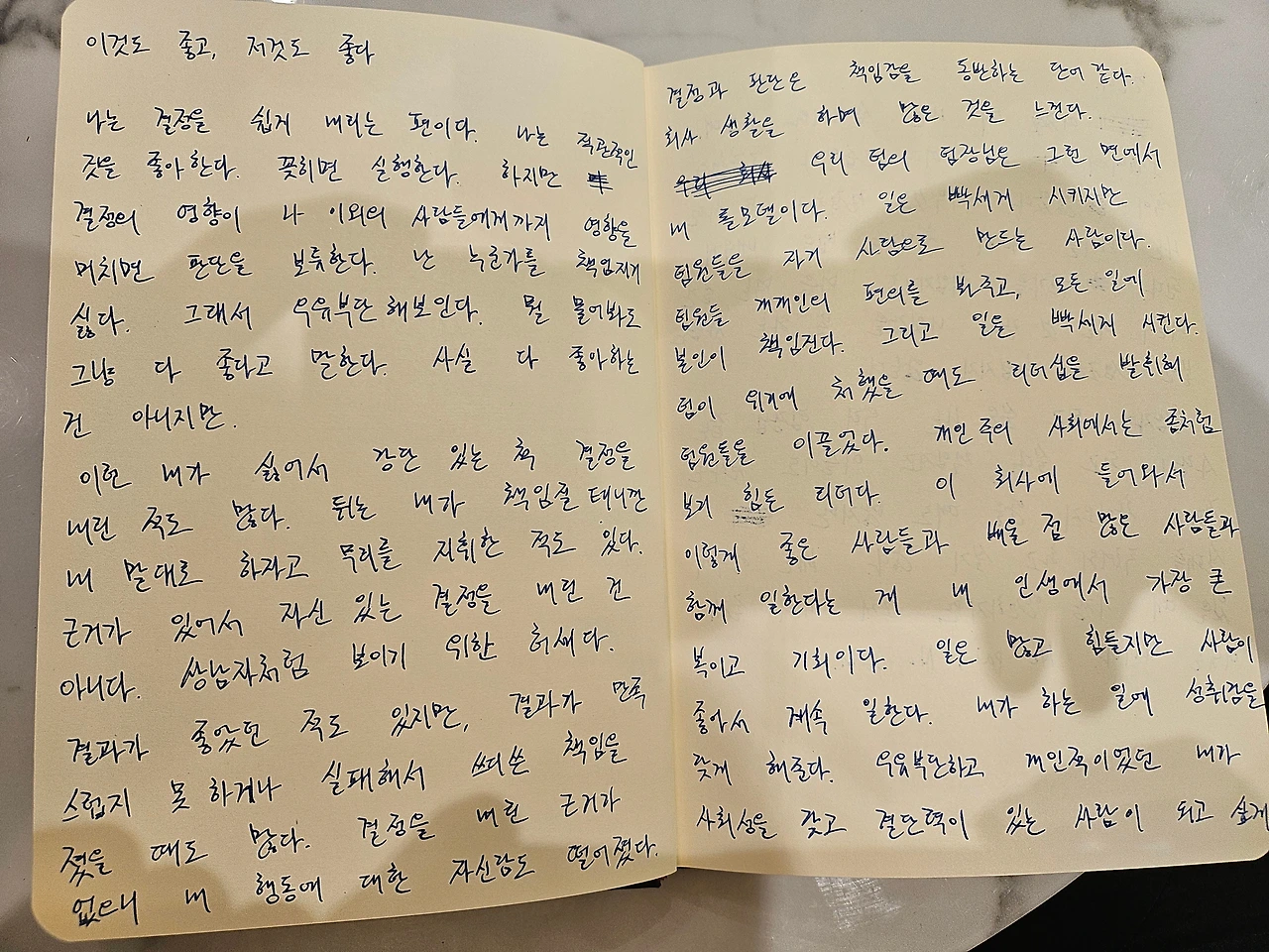 결정과 판단은 책임감을 동반하는 단어 같다. 회사 생활을 하며 많은 것을 느낀다. 우리 팀의 팀장님은 그런 면에서 내 롤모델이다. 일은 빡세게 시키지만 팀원들을 자기 사람으로 만드는 사람이다. 팀원들 개개인의 편의를 봐주고, 모든 일에 본인이 책임진다. 그리고 일을 빡세게 시킨다. 팀이 위기에 처했을 때도 리더십을 발휘해 팀원들을 이끌었다. 개인주의 사회에서는 좀처럼 보기 힘든 리더다. 이 회사에 들어와서 이렇게 좋은 사람들과 일한다는 게 내 인생에서 가장 큰 복이고 기회이다. 일은 많고 힘들지만 사람이 좋아서 계속 일한다. 내가 하는 일에 성취감을 갖게 해 준다. 우유부단하고 개인적이었던 내가 사회성을 갖고 결단력이 있는 사람이 되고 싶게 만든다.