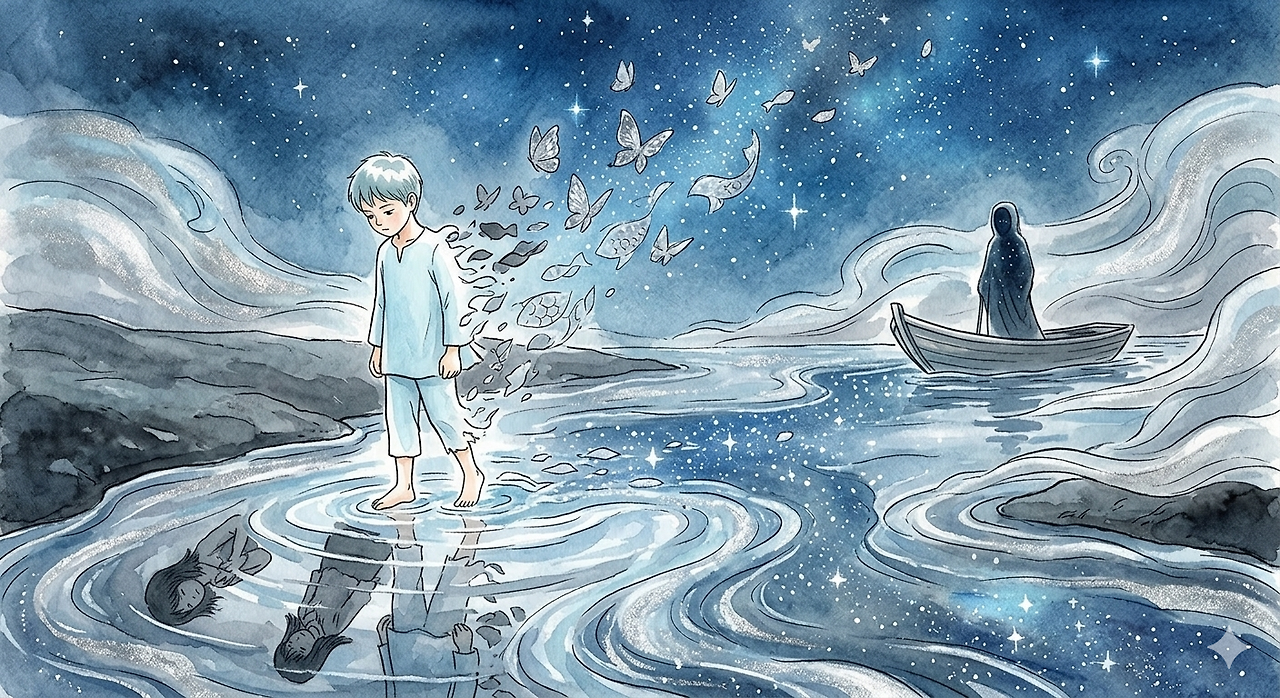 강가에는 얼굴이 없는 사공이 낡은 배 한 척을 세워두고 기다리고 있었습니다. 사공의 몸은 강물처럼 투명했고, 그가 입을 열 때마다 안개가 흩어지는 소리가 났습니다. 사공이 소년에게 물었습니다.
