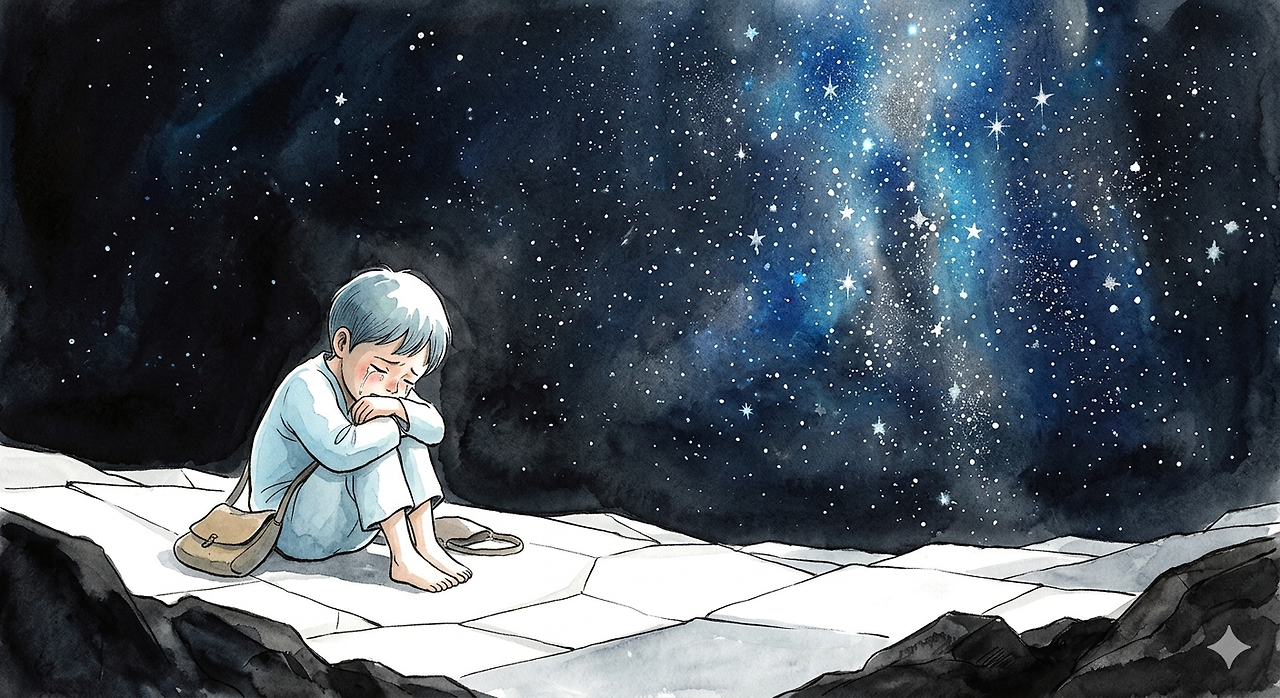 길을 잃은 소년이 절망에 겨워 다시 바닥에 엎드려 숨을 헐떡였을 때였습니다. 울음이 잦아들고 심장 박동 소리만이 고요를 채우자, 사방을 짓누르던 적막 속에서 기적이 일어났습니다. 소년이 겨우 고개를 들자, 단 한 번도 본 적 없는 밤하늘의 별들이 폭포처럼 쏟아져 내렸습니다. 억겁의 시간 동안 눈부신 빛 뒤에 숨어있던 별들이 소년의 눈동자에 선명하게 박혔습니다. 소년은 처음으로 깨달았습니다. 진정한 빛은 가장 깊은 어둠 속에서야 비로소 온전한 형태를 갖는다는 것을요.