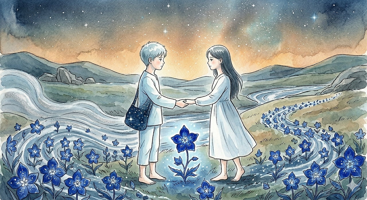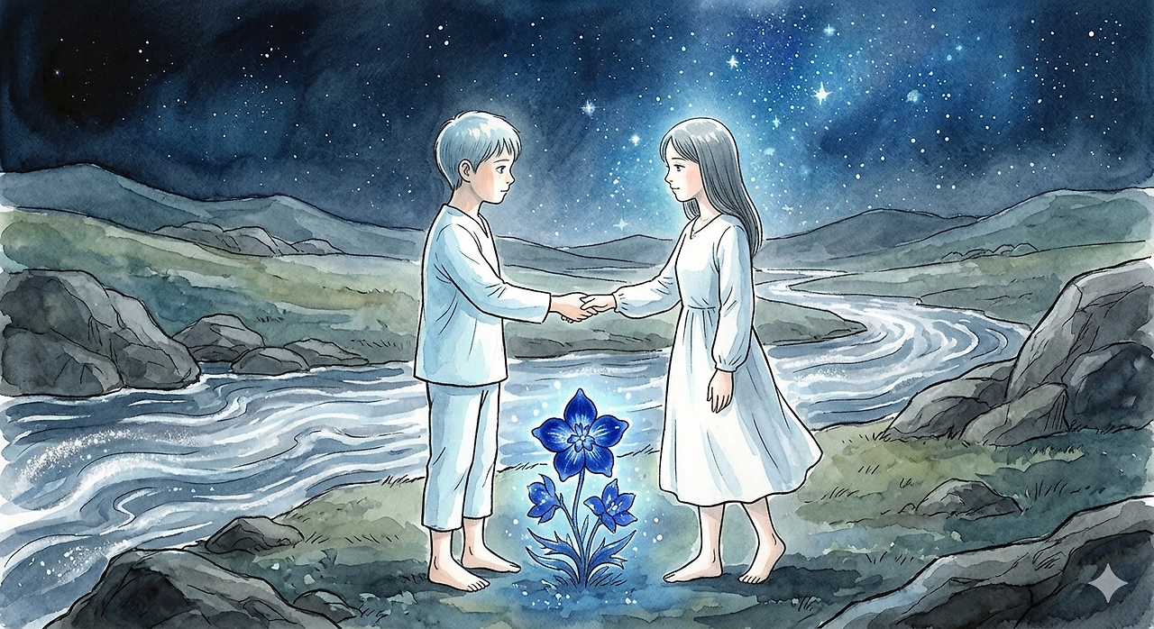 두 사람이 마주 잡은 손 사이로 푸른 델피늄 한 송이가 피어올랐습니다. 그림자 없는 마을의 서툰 사랑은 강물에 씻겨 가고, 서로의 밤을 지켜줄 두 개의 별은 푸른 꽃향기 속에서 다시 사랑하기 시작했습니다.