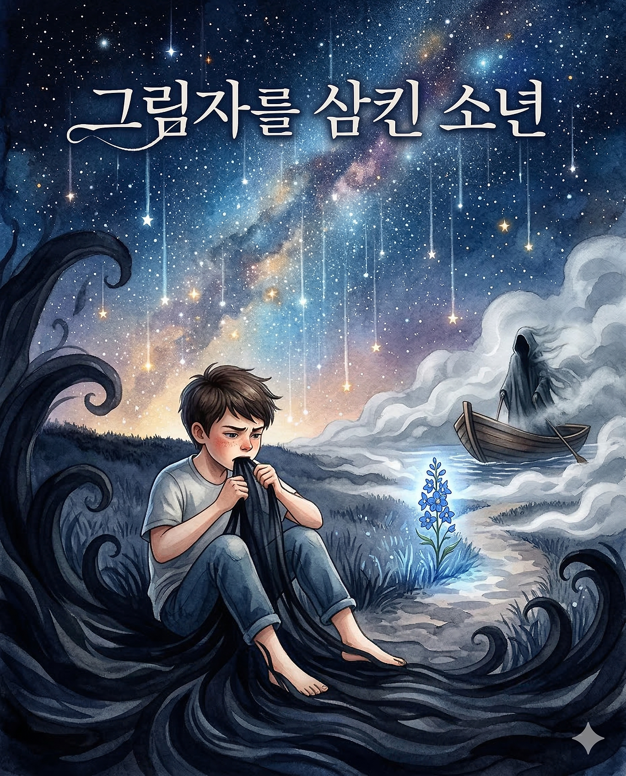 소년은 밤하늘의 별을 따라 걷기 시작했습니다. 하지만 발밑에 늘어진 자신의 그림자가 무거워 한 발자국도 뗄 수 없었습니다. 소년은 제자리에 앉아 자신의 그림자를 하나씩 씹어 삼켰습니다. 그림자를 삼킬 때마다 가시 돋친 기억들이 목을 찔렀지만 소년은 피하지 않았습니다. 마침내 마지막 그림자까지 다 삼켜 몸이 깃털처럼 가벼워진 순간, 별빛이 흐르는 끝자락에서 은빛 안개가 소용돌이치는 망각의 강이 나타났습니다.