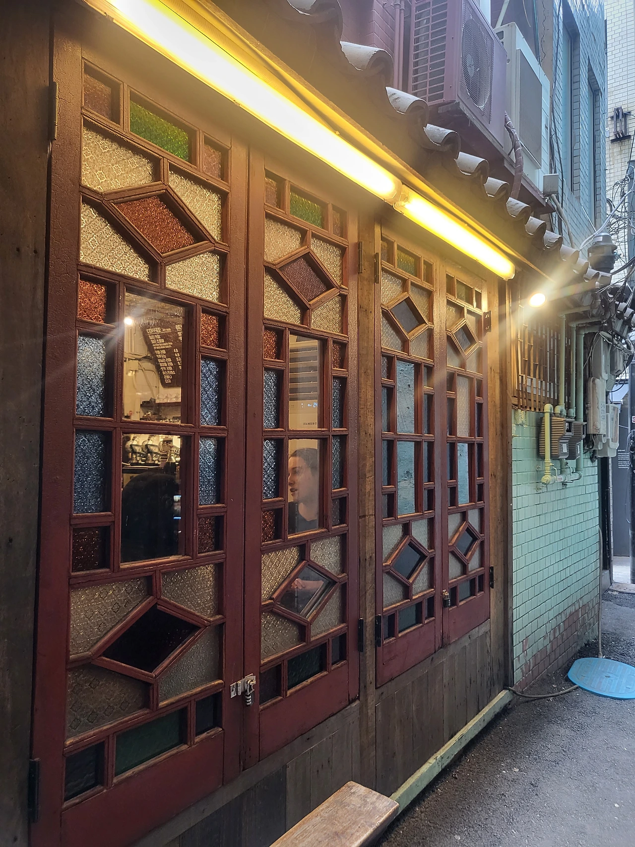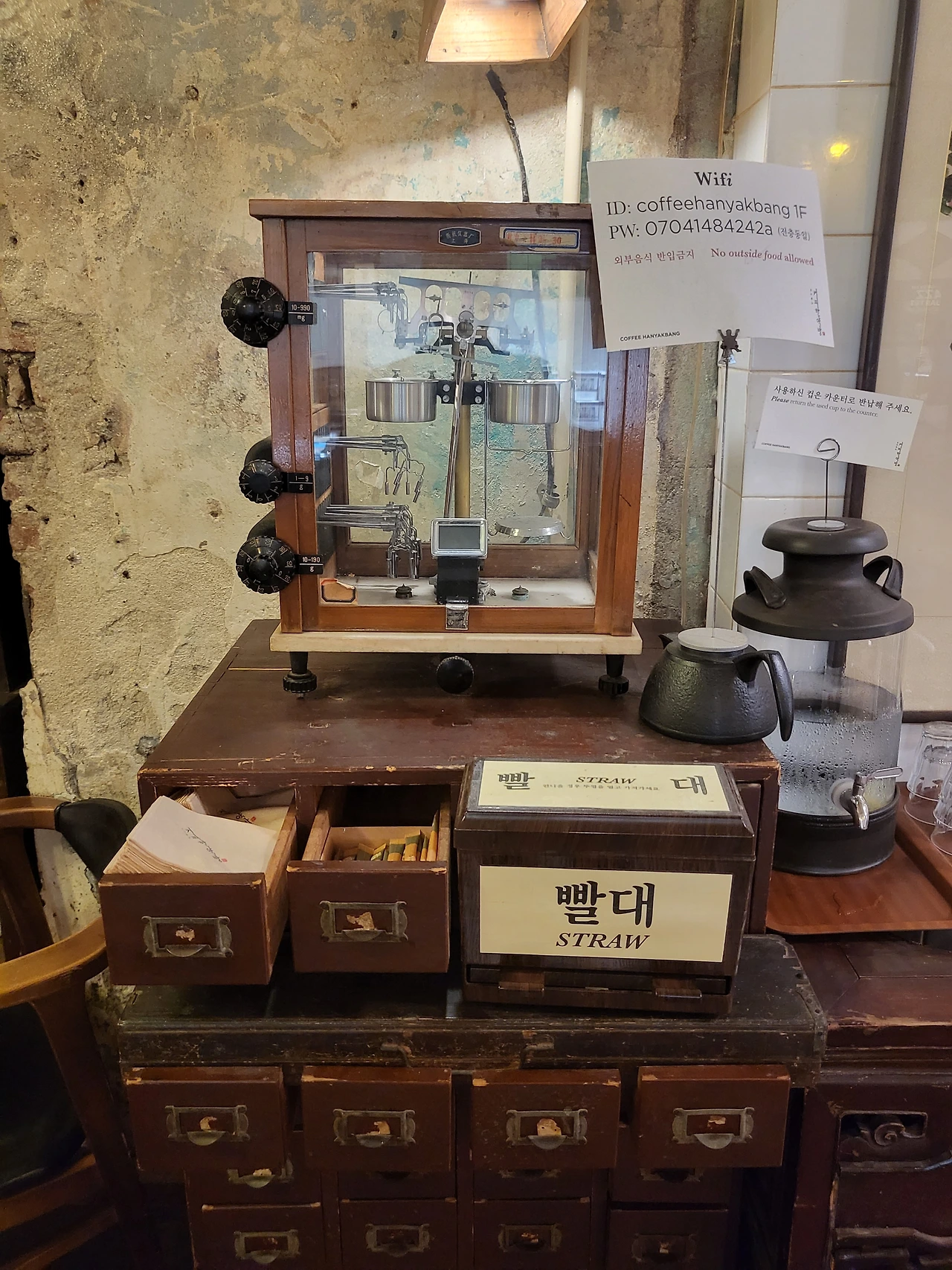 걸어서 을지로까지 가고 싶었지만 8월의 무더위, 게다가 오후 2시는 걷기에는 무리였다. 다시 지하철을 타고 을지로 3가로 갔다. 예전에 인쇄소에 갈 일이 있어서 들렀던 카페였는데 인상적이어서 친구들과 함께 오고 싶었던 곳이었다. 조선시대 의료기관이었던 혜민서 건물을 개조한 '커피한약방'은 이름처럼 한약방 느낌을 재현해 낸 모습이었다. 을지로는 옛 모습 그대로의 골목길이 남아 있는데 좁은 골목으로 들어서면 주홍빛 불빛이 영화 속 한 장면처럼 은은하고 매력적으로 다가온다. 사진 찍기에도 좋고, 낭만을 즐기기에 좋다. 커피한약방에서 음료를 주문하고, 바로 옆 혜민당에서는 디저트를 주문해서 먹을 수 있다. 이층에도 자리가 있는데 2층 홀이 조금 넓다.