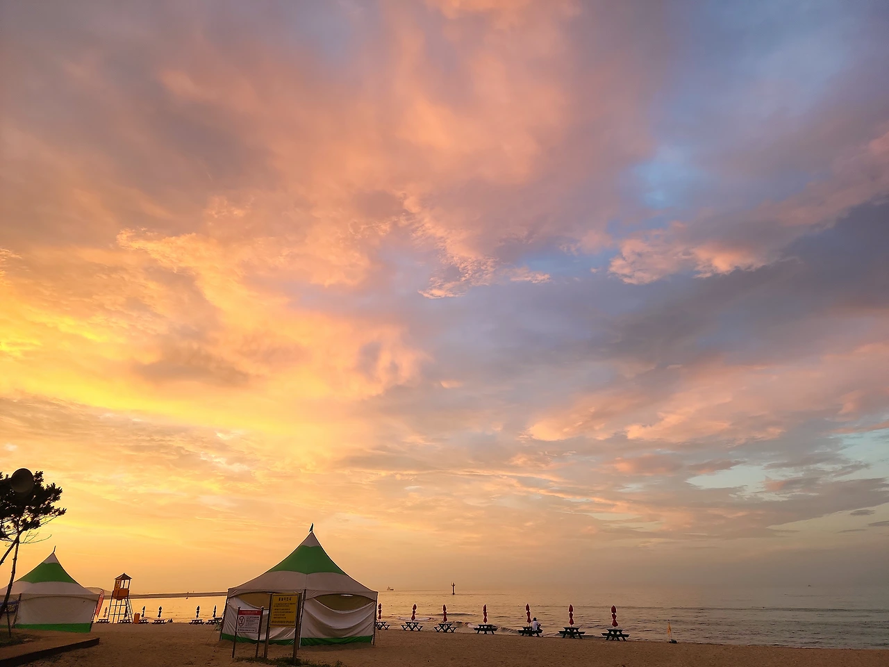 고등학생인 둘째는 영어, 수학 모의고사문제 풀이 등 학업계획을 촘촘하게 세웠고, 큰 아이는 두꺼운 전공 책 한 권을 챙겼다. 나는 여러 권의 책을 가지고 가려다 욕심을 버리고 단 한 권의 책만 읽기로 했다. 그런데 예상과는 달리 출발할 때 몇 방울 내리던 비는 금세 그치고, 하늘은 어느덧 푸른빛에 황금빛 물감을 흩뿌리며 몽환적인 풍경을 그려냈다. 책을 펼칠 새도 없이 우리를 부르는 바다로 뛰어갔다.