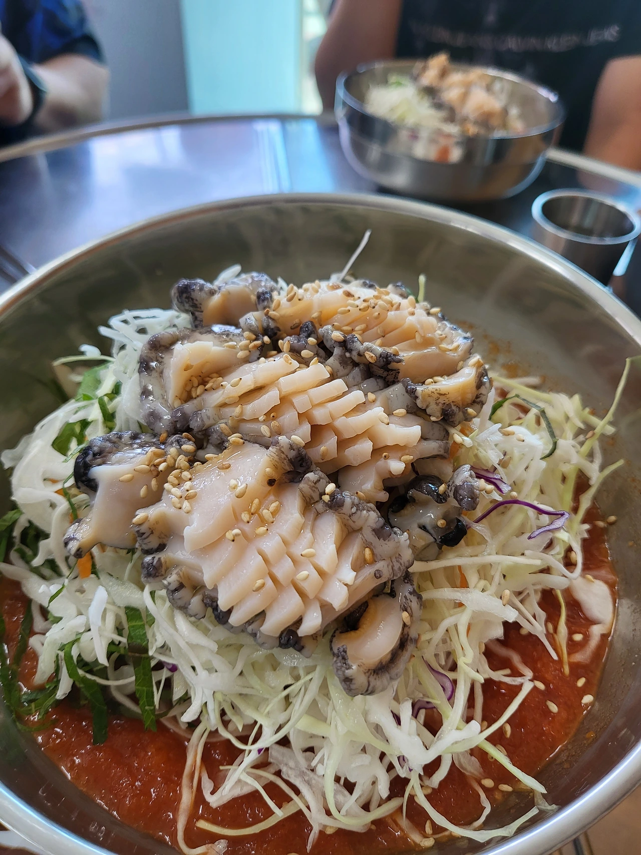 멍하니 풍경에 빠져 있다가 저녁이 되어 우리가 먹으러 간 것은 바닷가에서 흔한 물회와 대게였다. 눈처럼 소복하게 쌓아 올린 양배추와 각종 푸릇한 채소 그리고 쫀득하면서도 부드럽게 넘어가는 회와 싱싱하게 오독거리는 전복이 듬뿍 올라간 물회는 매운 양념까지 상큼해 맛깔스러웠다. 거기에 국수사리까지 말아먹으니 한 끼 식사로 든든할 법도 한데 사실 나는 바닷가에 오면 언제나 뭔가 허전하다. 회는 고추장 맛으로 먹고 전복비빔밥 정도는 먹어줘야 그나마 만족스럽다.