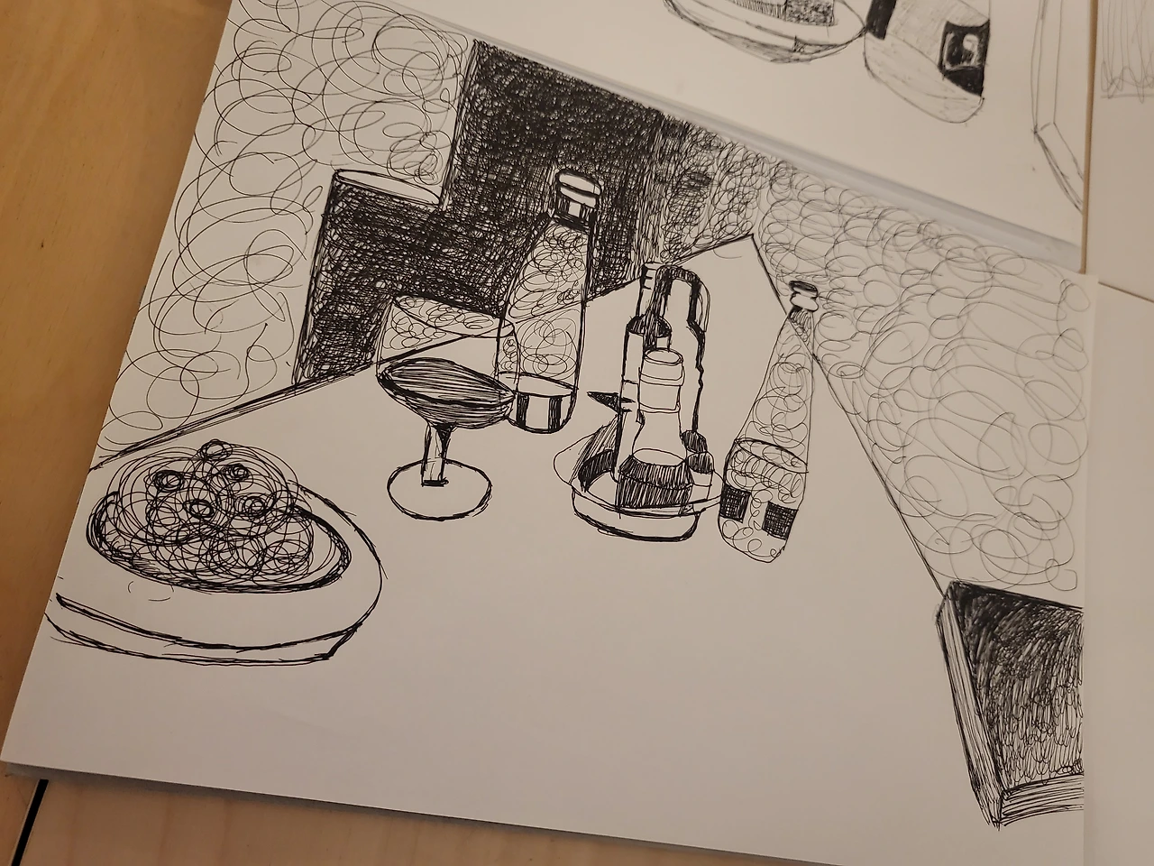 두 번째 종이에는 주어진 정물의 실루엣을 따라 그리고 다시 물체를 구체적으로 넣어 표현해 보는 것이었다.한 선 한 선 가르침에 따라 그어 보고 칠해 보면서 내가 막연하게 생각하던 부분이 무엇이었는지 스스로 알아가는 시간이 되었다.