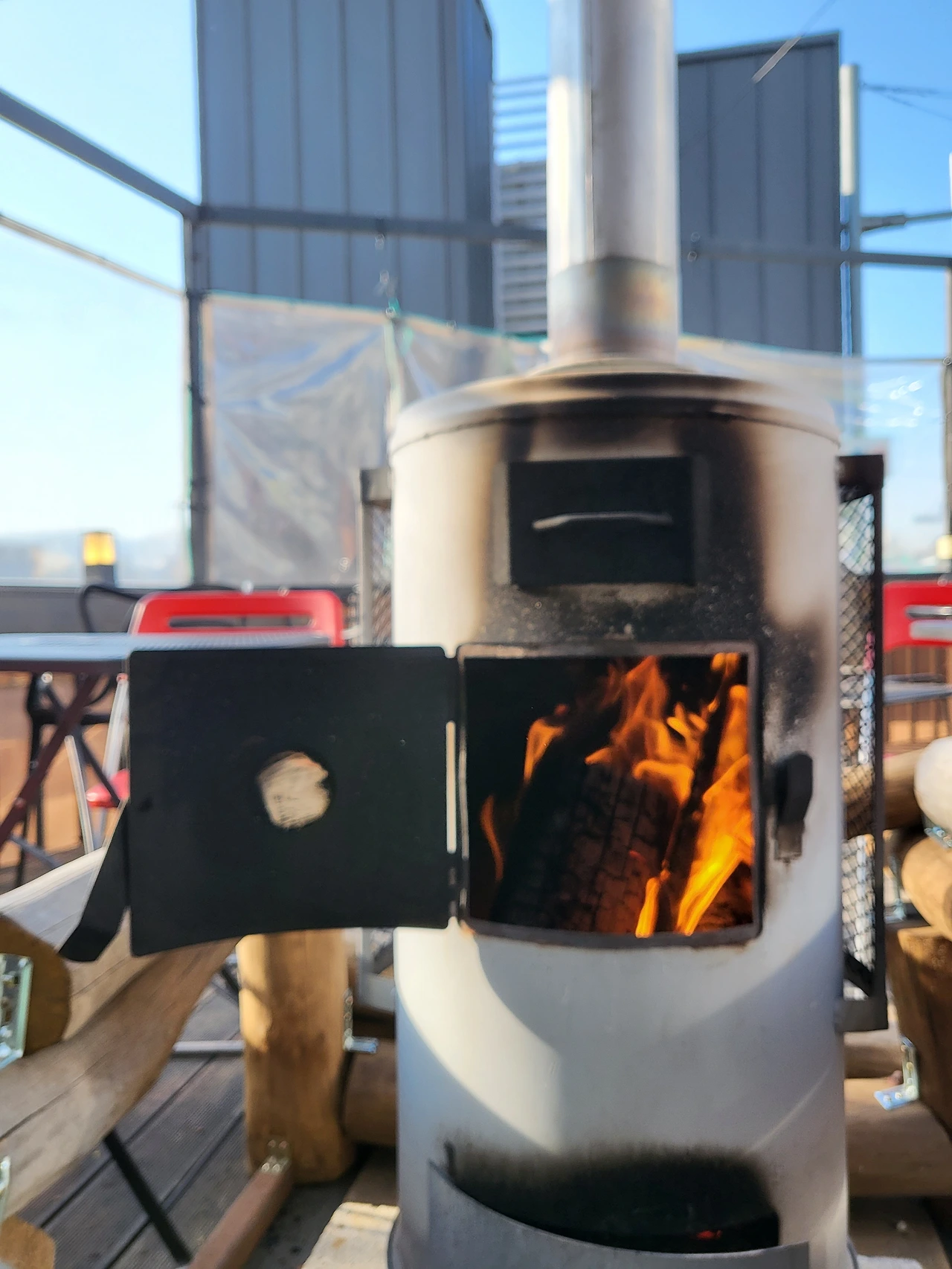 그 모습이 좋아 잠시 테라스에 앉았다. 주인장이 난로 옆에 앉으라고 권하며 고구마를 굽기 시작한다.