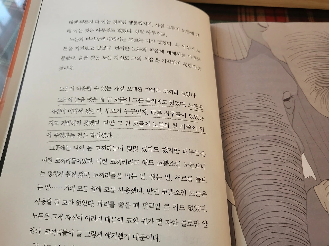 노든이 떠올릴 수 있는 가장 오래된 기억은 코끼리 코였다. 노든이 눈을 떴을 때 긴 코들이 그를 둘러싸고 있었다.
